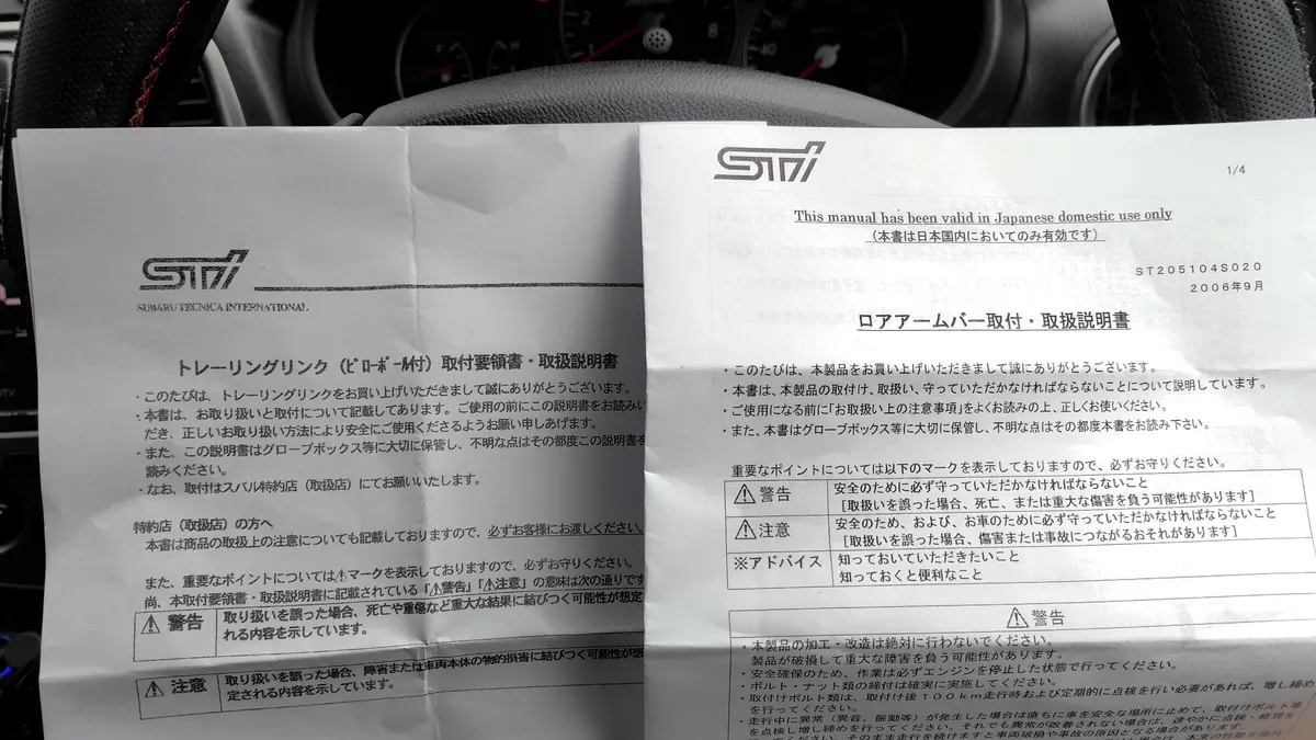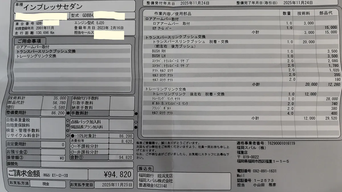 今回交換した「ロアアームバー」「トランスバースリンクブッシュ」「トレーリングリンク」は全てSTI製パーツを使用しました