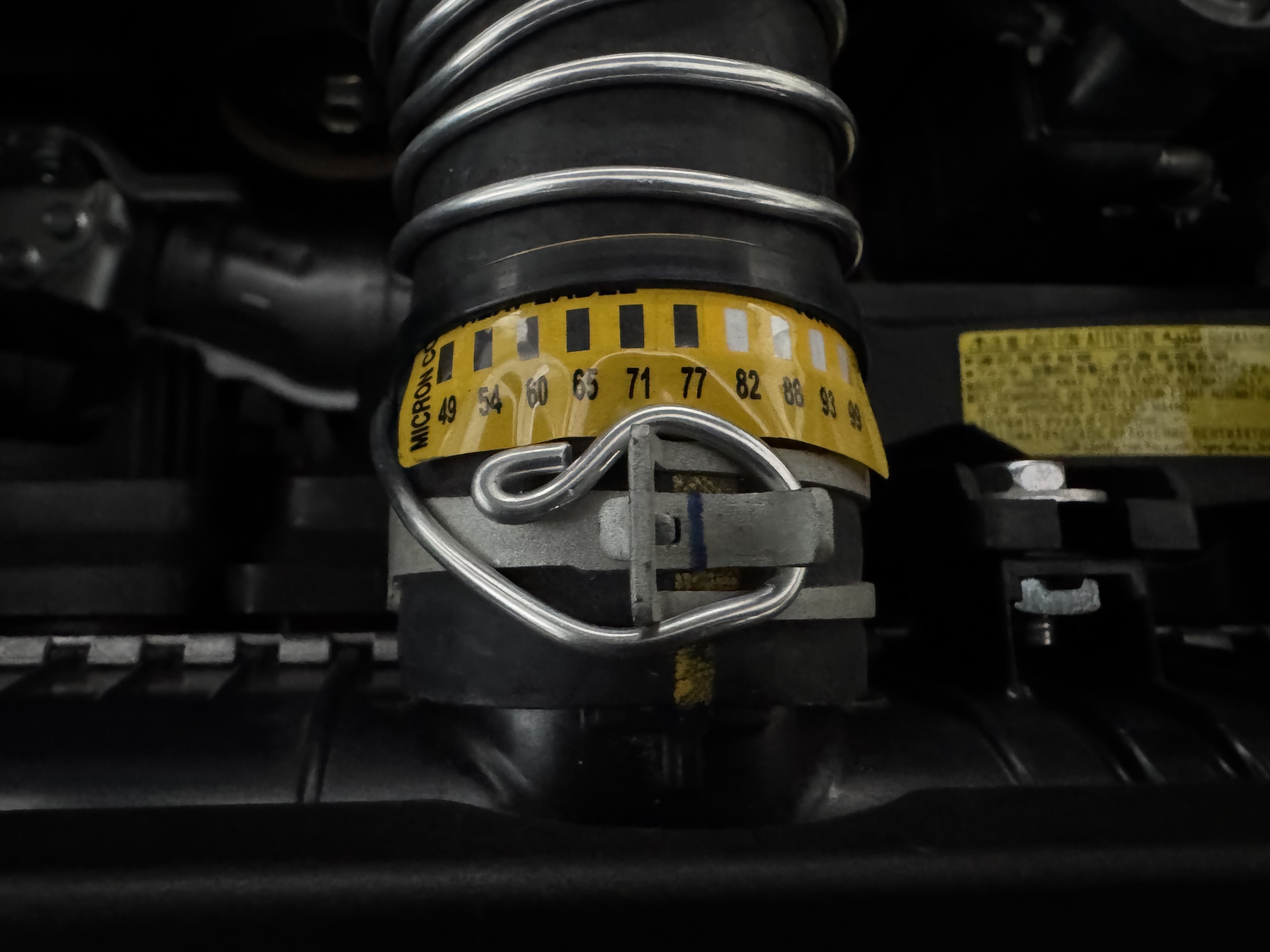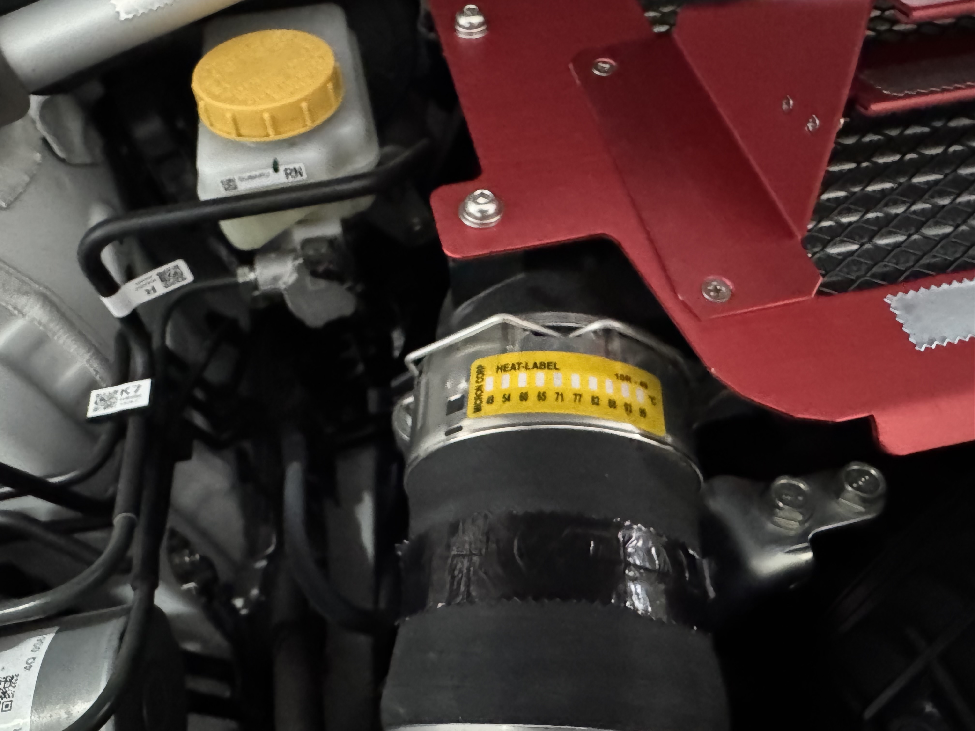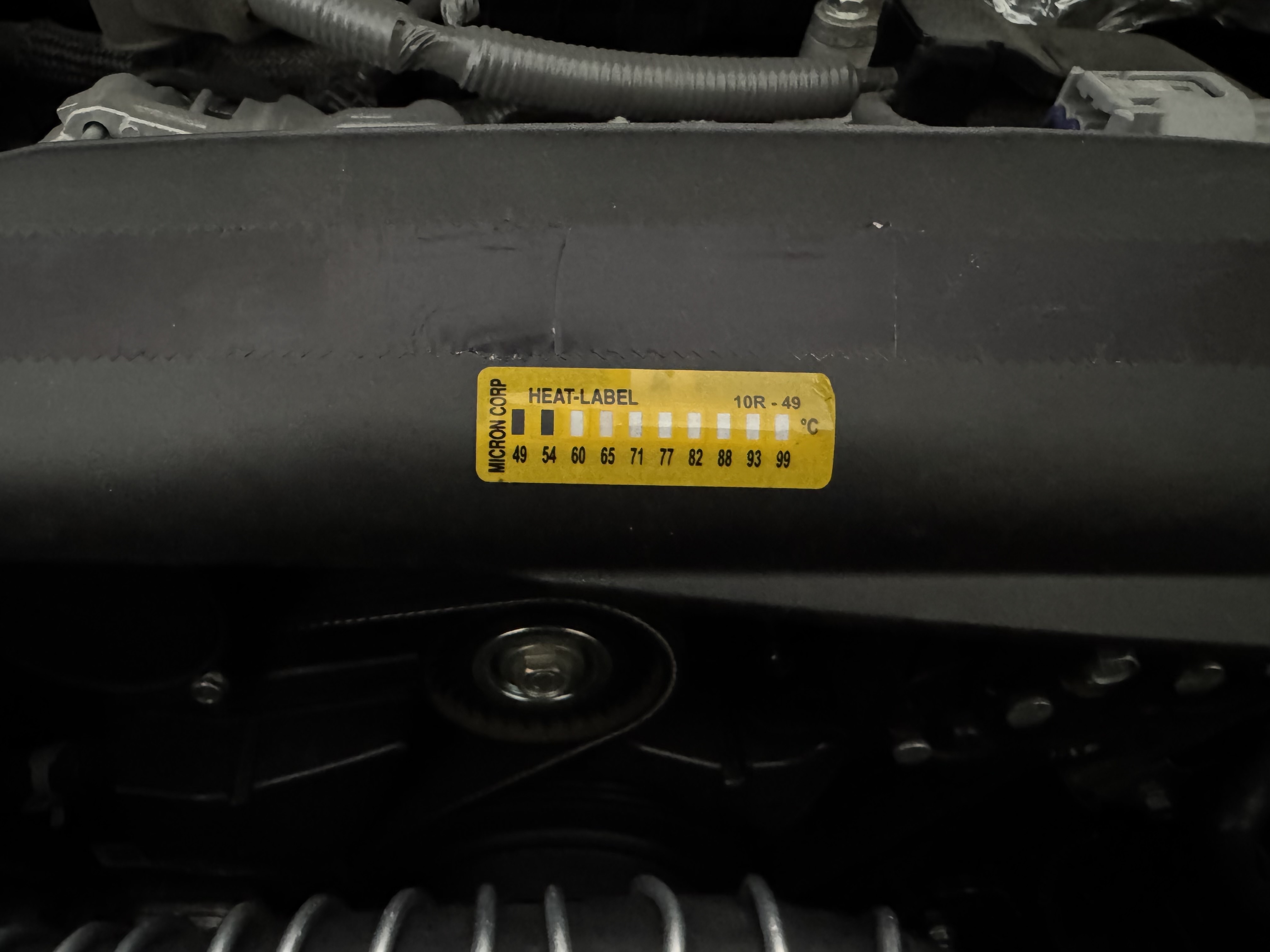 仕事では主に100~260度前後の高い温度域のシールを使ってましたが、車なら100度まで分かれば良いかな、とレヴォーグのエンジンルームの各所に貼ってみました。