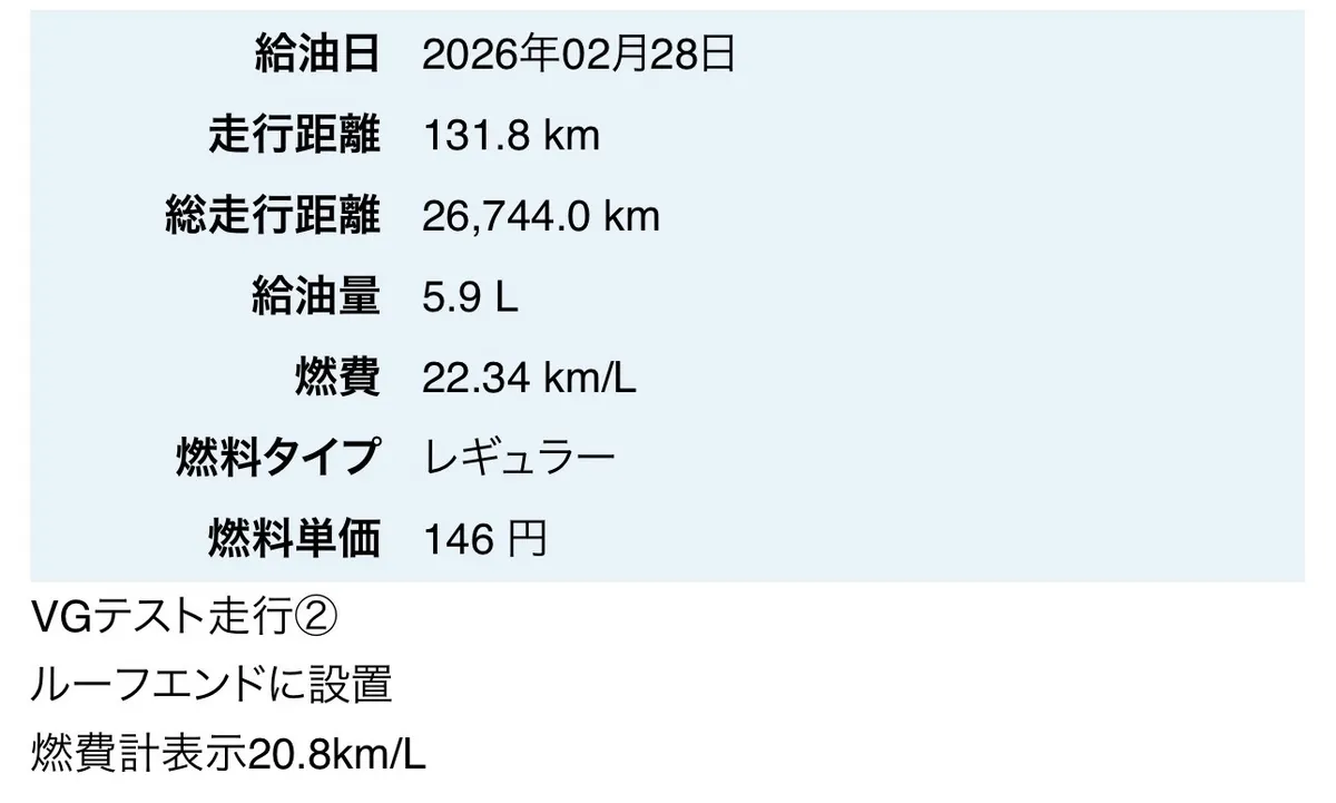 私のVNレヴォーグは長距離移動をメインとして乗っているので、これまでの総走行距離26,700キロほどでの平均燃費が16.3km/Lとまあまあ良い方だと思うのですが、VGを貼り付けてテスト走行してみた結果、22km/Lと燃費記録を大幅に更新しました!😆
