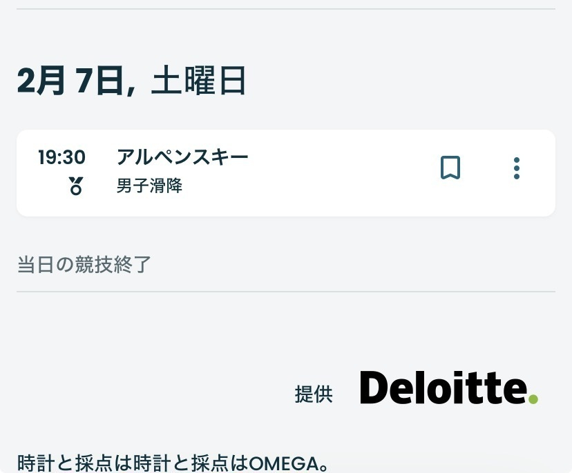 トップ > キャンプ&アウトドア部 > ウィンタースポーツ部 > Milano Cortina Orimpics がー 2026/02/07 11:39 Milano Cortina Orimpics 今日は男子滑降が19時30分から決勝です。 今回のオリンピックは男女で会場もちがうんですね。 滑降は他の競技と違って危ないので予選なしの一発勝負!昨日まではコースを確認する公式練習のみやっていました。 120km/hを超える滑走速度。 コースによっては100m近くジャンプすることもあります。 同じくらいスピードの出る競技はあっても自分の力だけで制御して曲がるのは唯一無二。 日本人は誰も出場しませんのでテレビでは…。 YouTubeでダイジェスト版とかないかな? いいね 共有する 共有する X facebook LINE リンクをコピー コメントする 1 件の返信 (新着順) ミュートしたユーザーの投稿です。 投稿を表示 テレマーカー 2026/02/07 14:39 がー こんにちは! 先程テレビで番組表を確認したら、ダウンヒルは録画で今夜8:35〜9:55 NHK BSで放送するようです。 あとはネット検索したところTVerでLIVE配信予定あるみたいです。 スラロームなども良いけどダウンヒルはスリル満点で楽しいですね! いいね 返信する