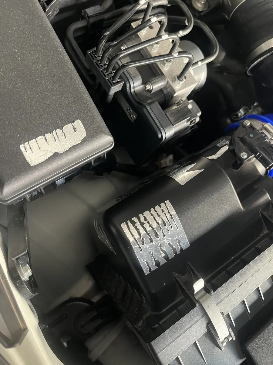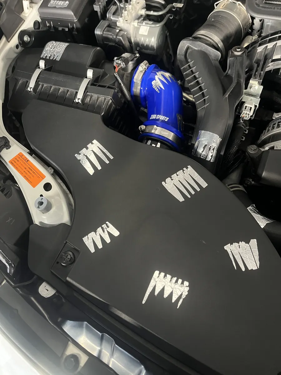 まず吸気部分、目に見える範囲の樹脂パーツに除電のためアルミテープを貼りまくってます。空気がたくさん、速く流れる部分になりますので、その分多くの静電気を放電させるため、貼ってます。エアフロセンサー付近も忘れずに。放電させ、空気をスムーズかつロスなくエンジンに届けさせるよう“道”を作るためです。
