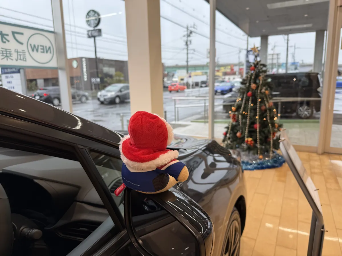 ディーラー内でクリスマスツリーを見つめるくまこっこ🎄(担当さんにくまを乗せる事は了解を得ています)