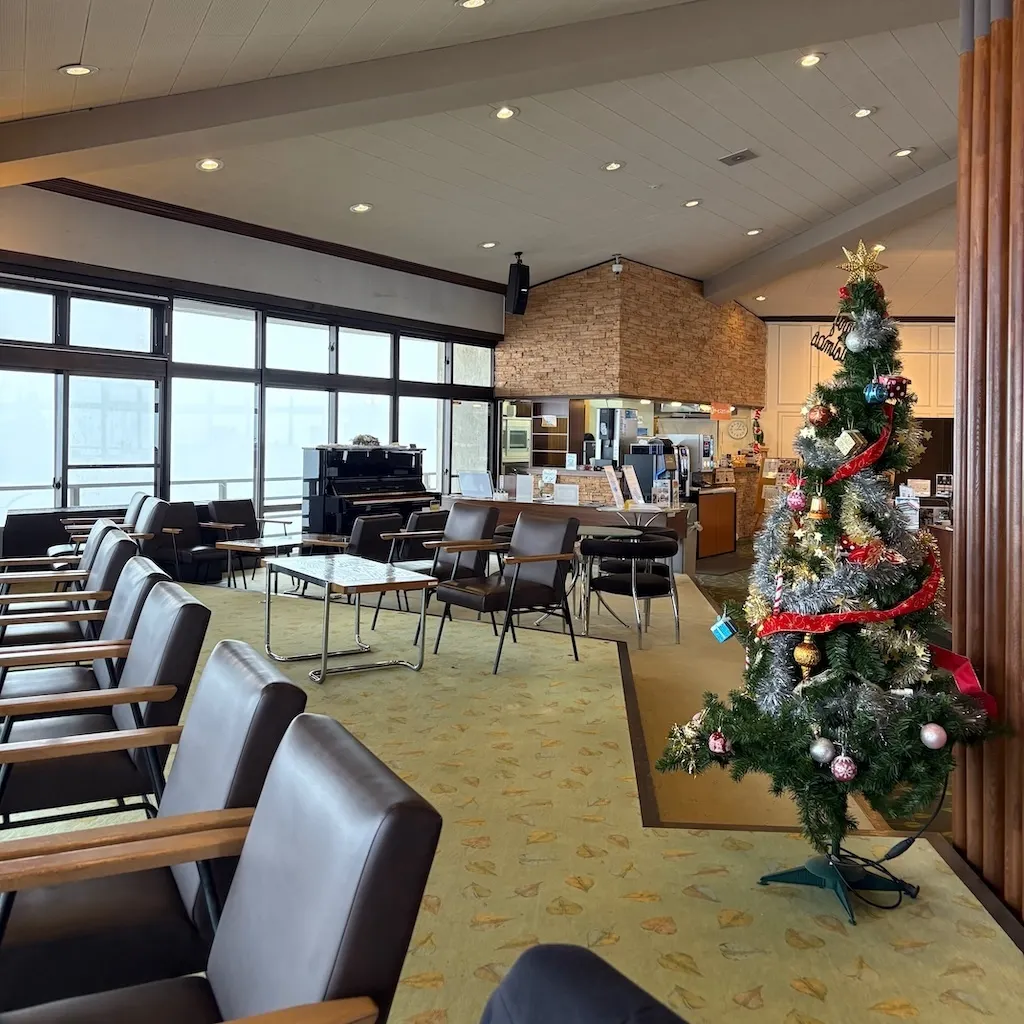 中はクリスマス!外とはギャップのある暖かさ。周囲が霧で見えませんが、幻想的で心が落ち着きます。お客さんも少しいました。