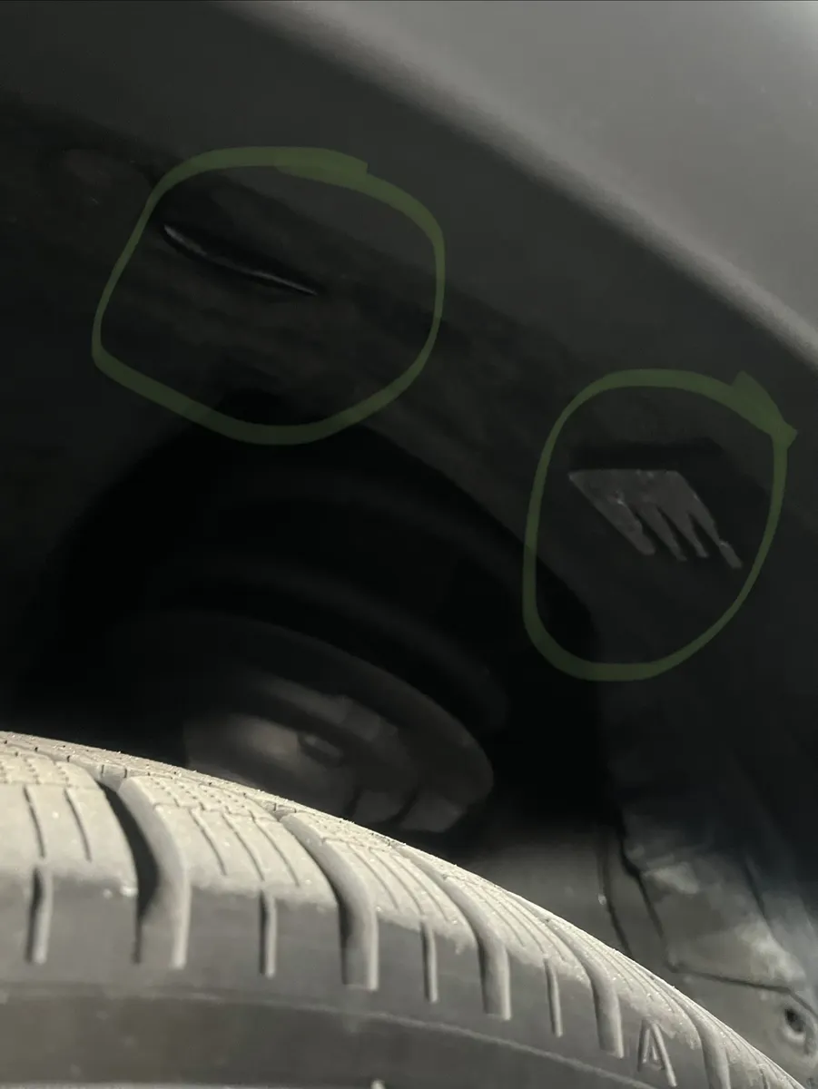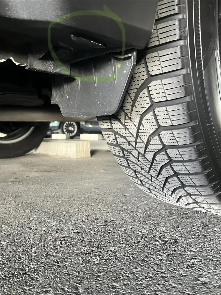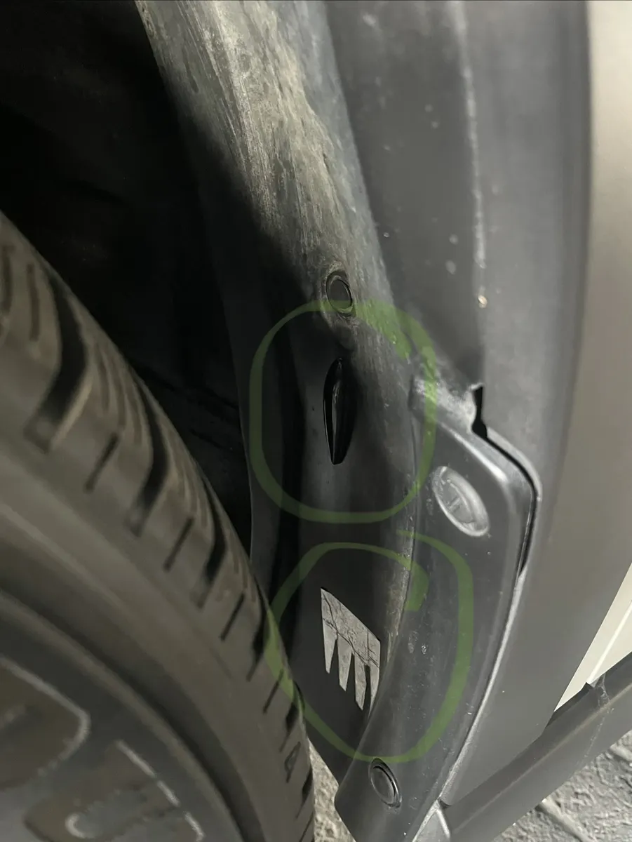 フロントタイヤから5cmほど前方の樹脂部分で、ボルテックスジェネレーターを左右2つずつつけました。前タイヤに当たる風を外に逃すようにしてます。純正ではタイヤ直前にフラップがあり乱流が生まれやすい箇所なので、その流れを整える役目も持っています。またアルミテープも除電のためつけてます。