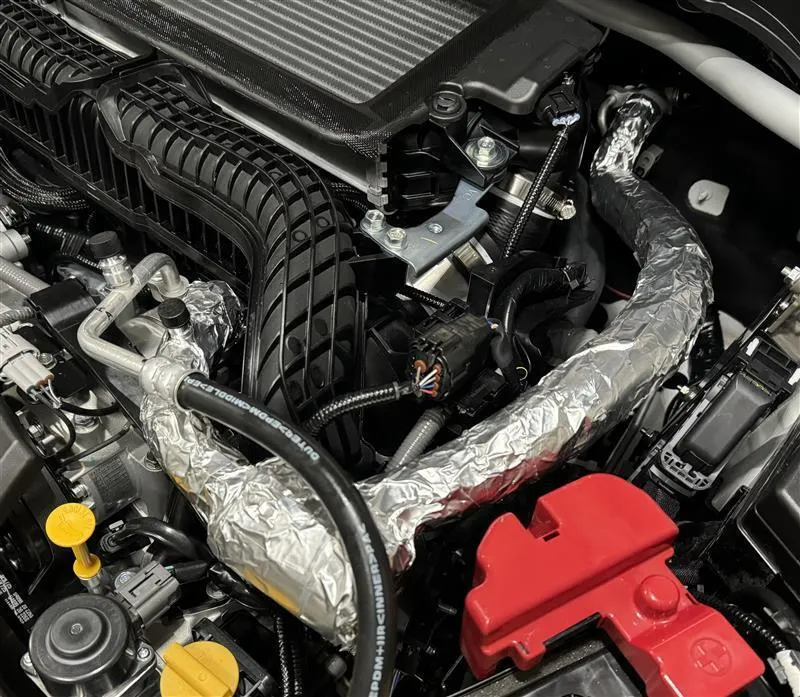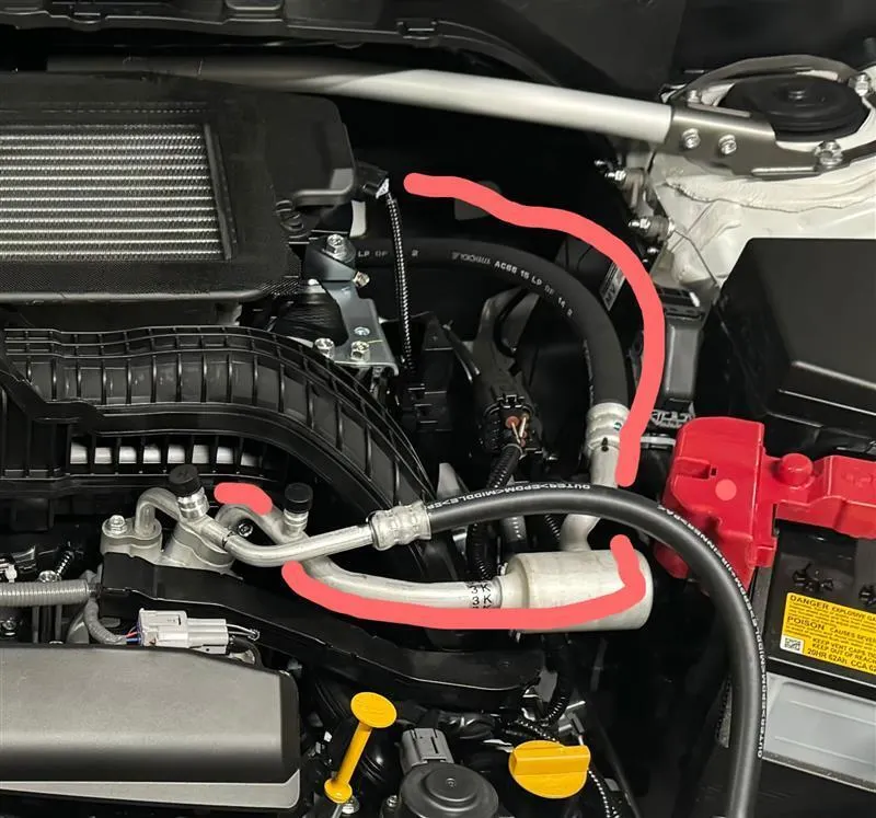 夏の時期、エアコンをかけた状態でレヴォーグのエンジンルームを見ていると、エアコンの低圧側配管(冷たくなる方)が結露でびしょびしょになっているのに気が付きました。