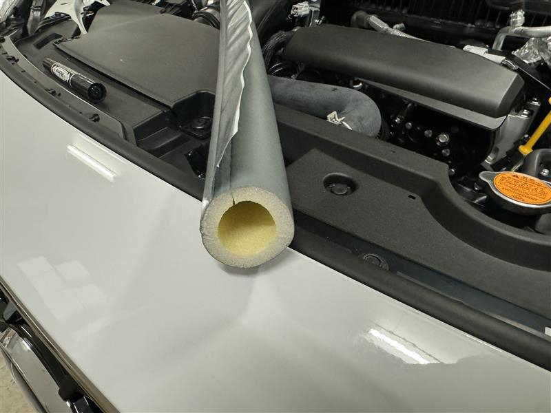 それだけエアコンの効きが良いということなのでしょうけど、結露した水滴がポタポタとエンジンルーム内に垂れるのは嫌だなぁと、ホームセンターで普通に置いてある保温パイプを配管に被せることにしました。