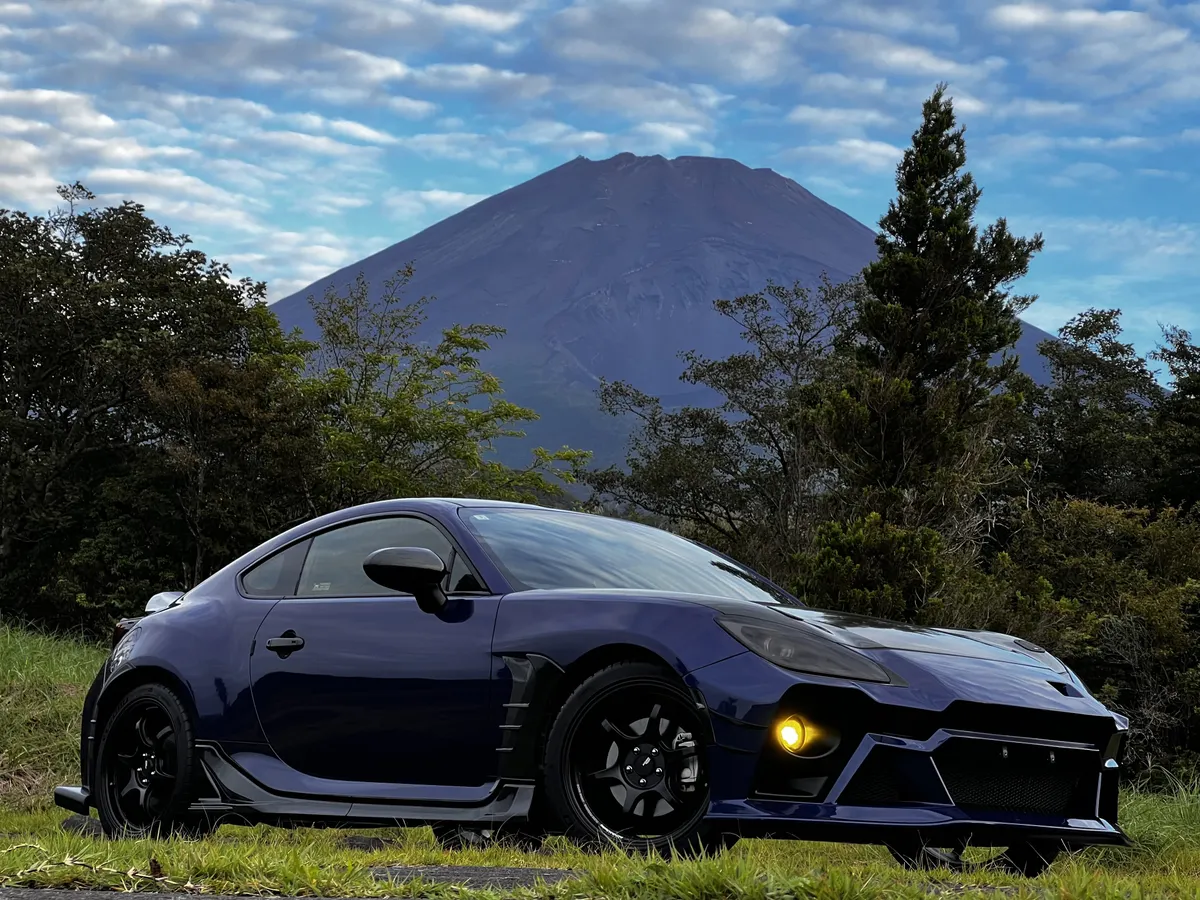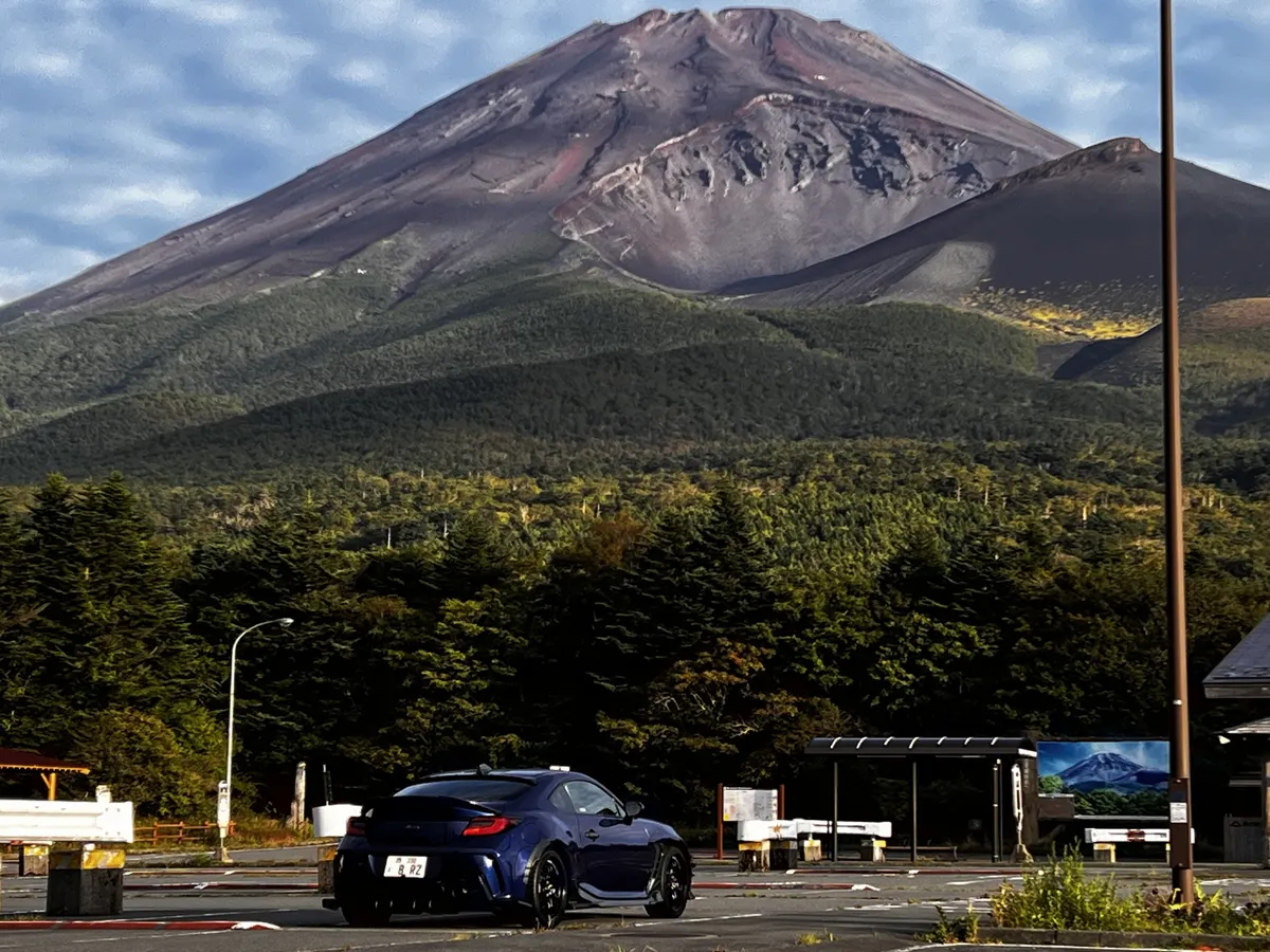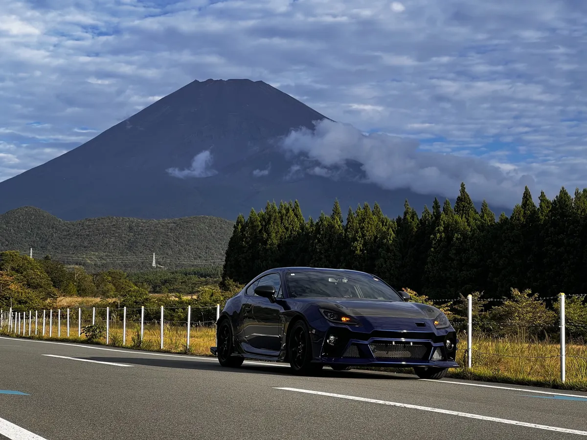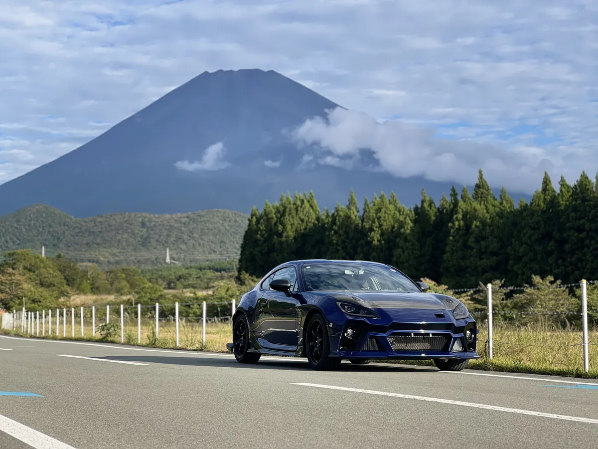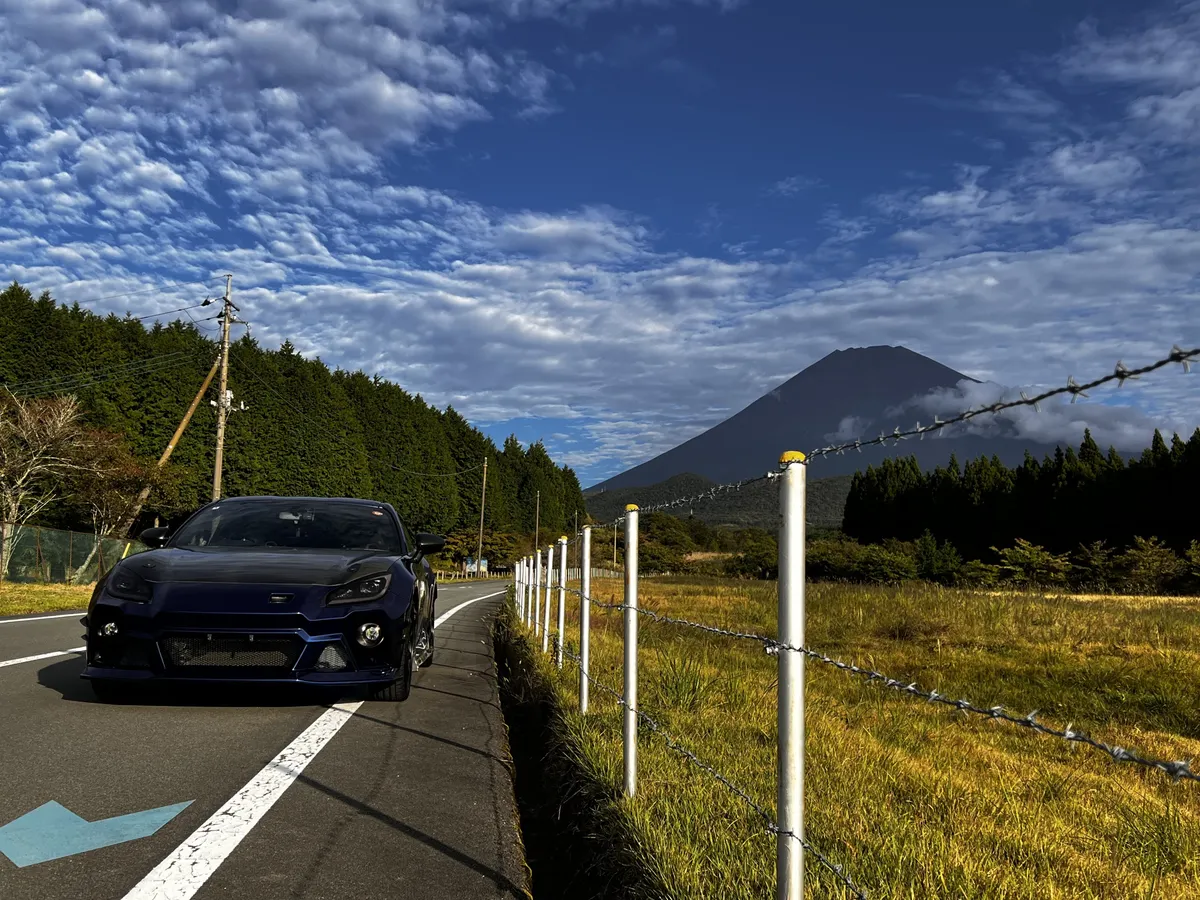 斜め構図の富士山とBRZ
