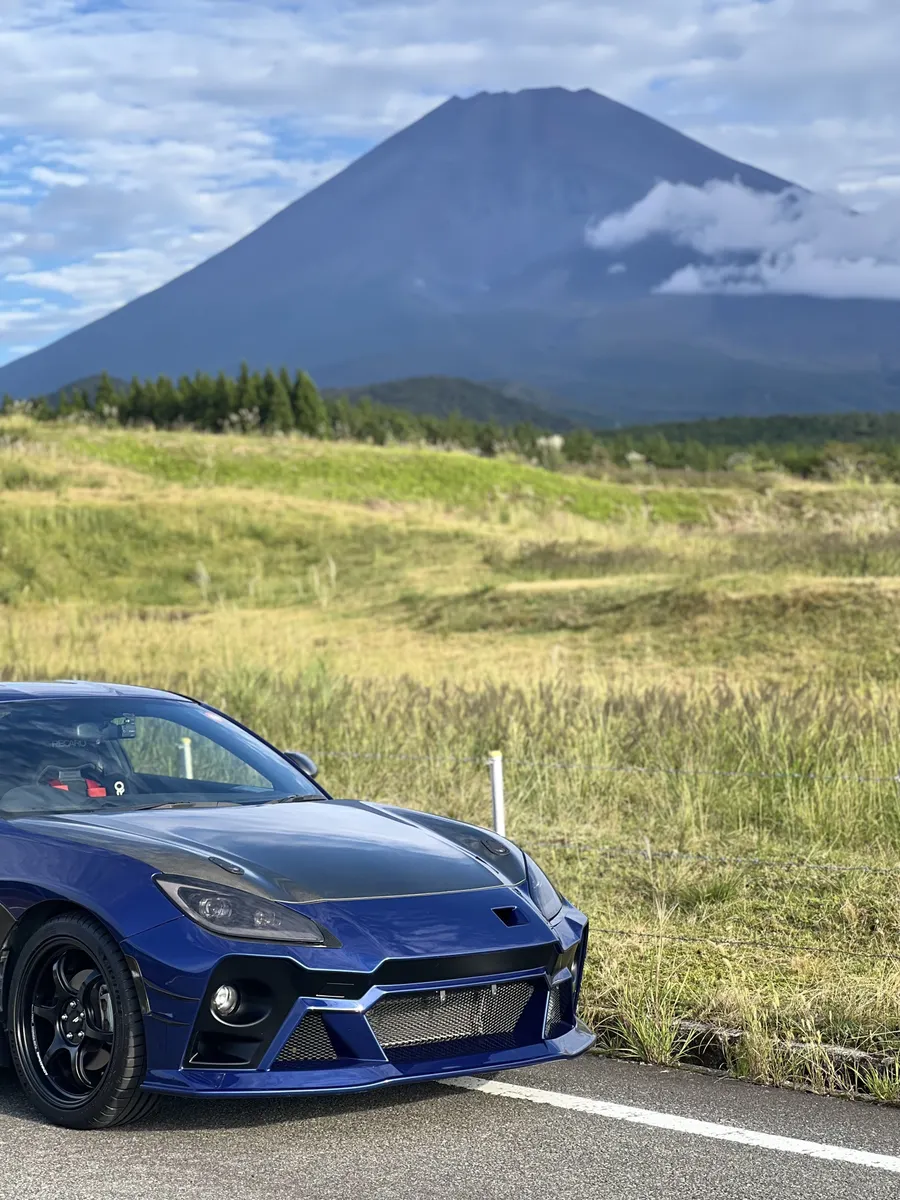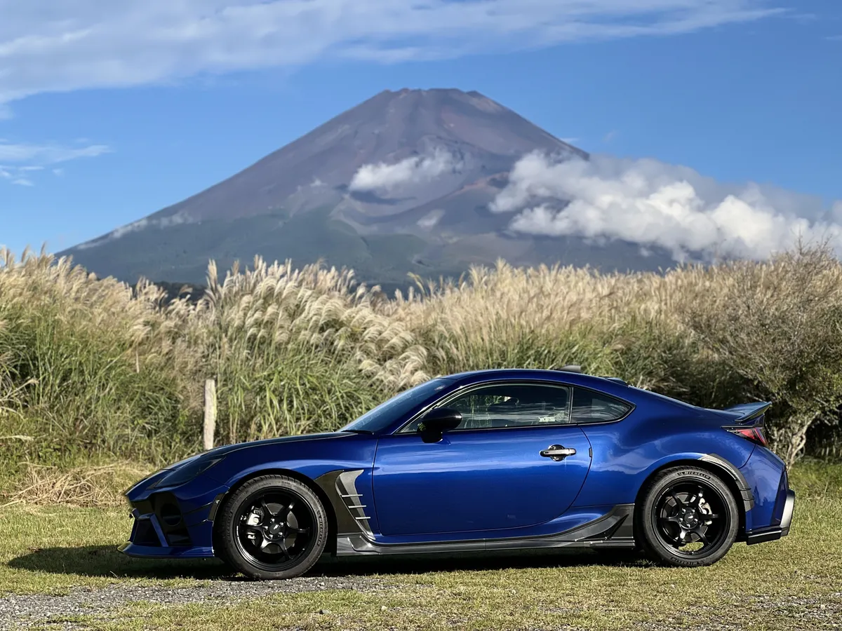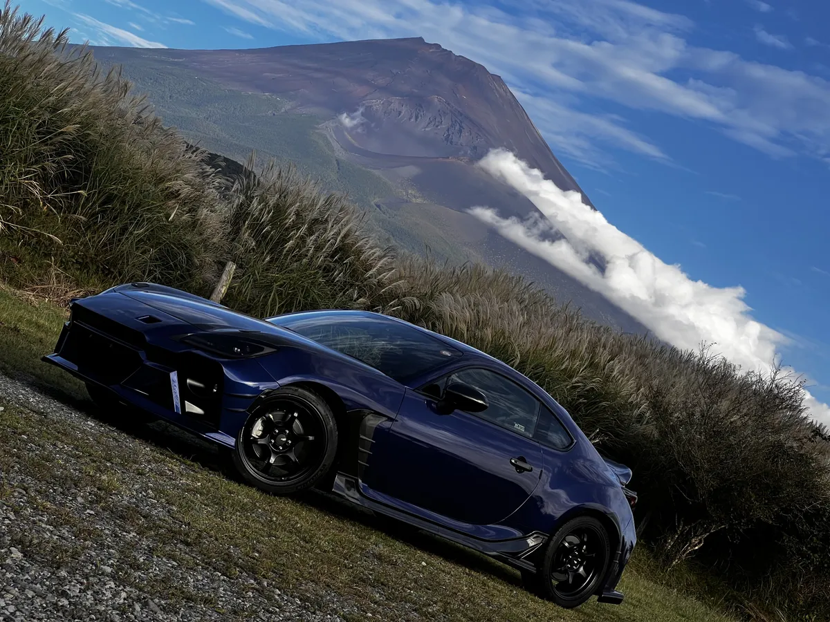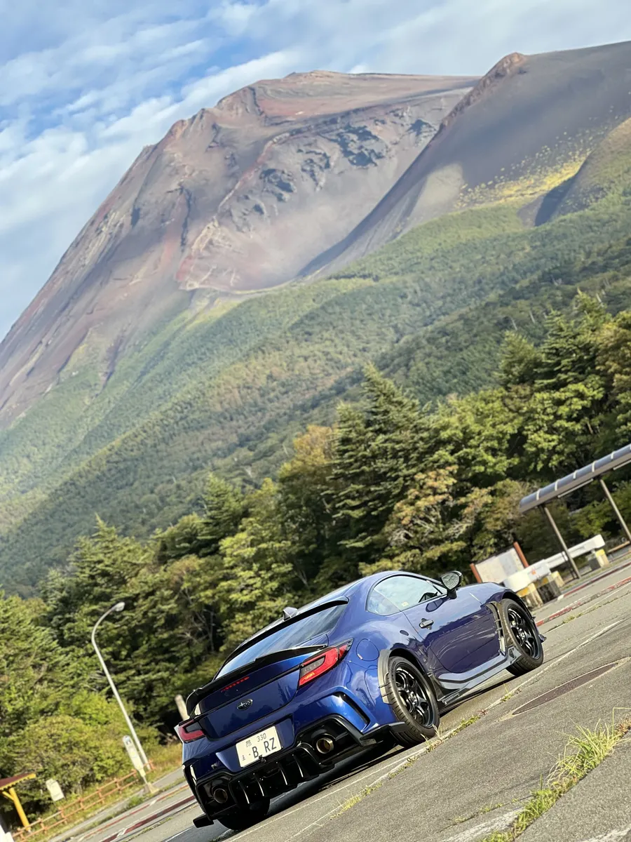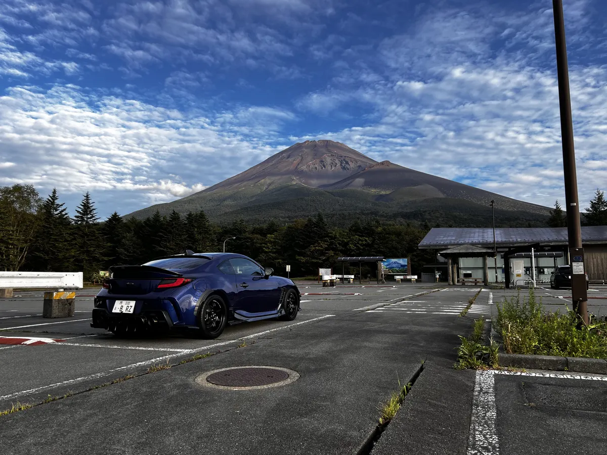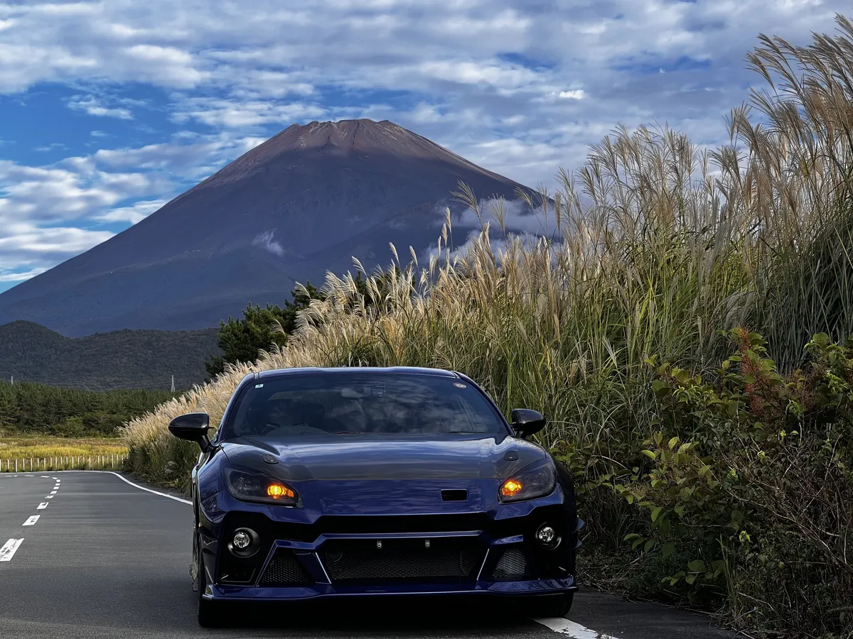 斜め構図の富士山とBRZ