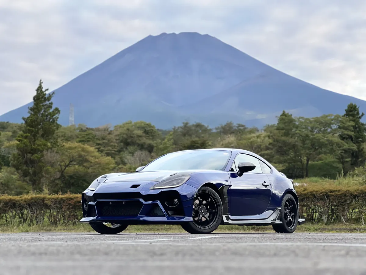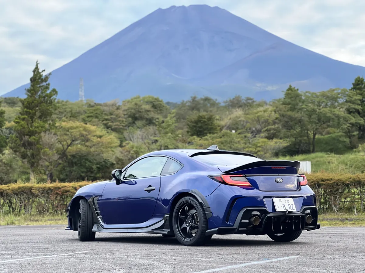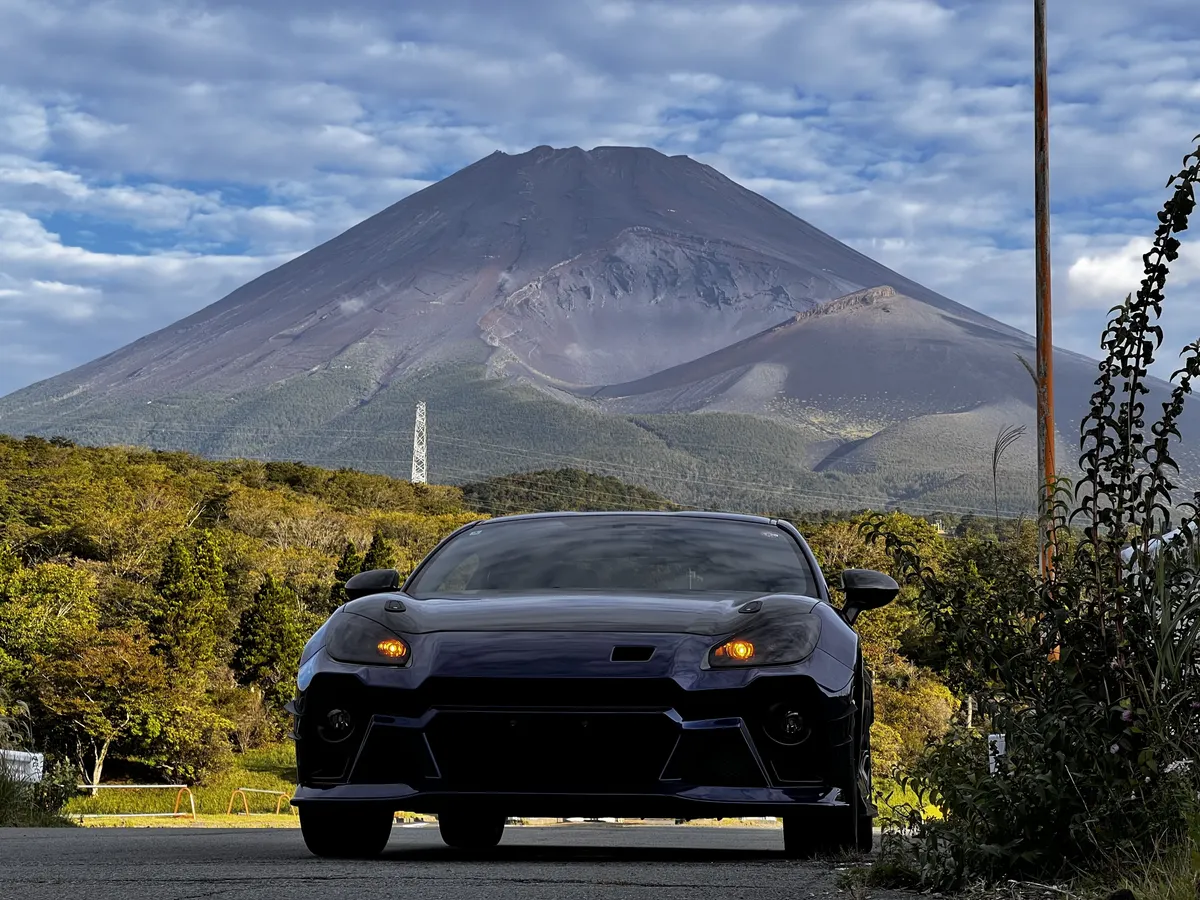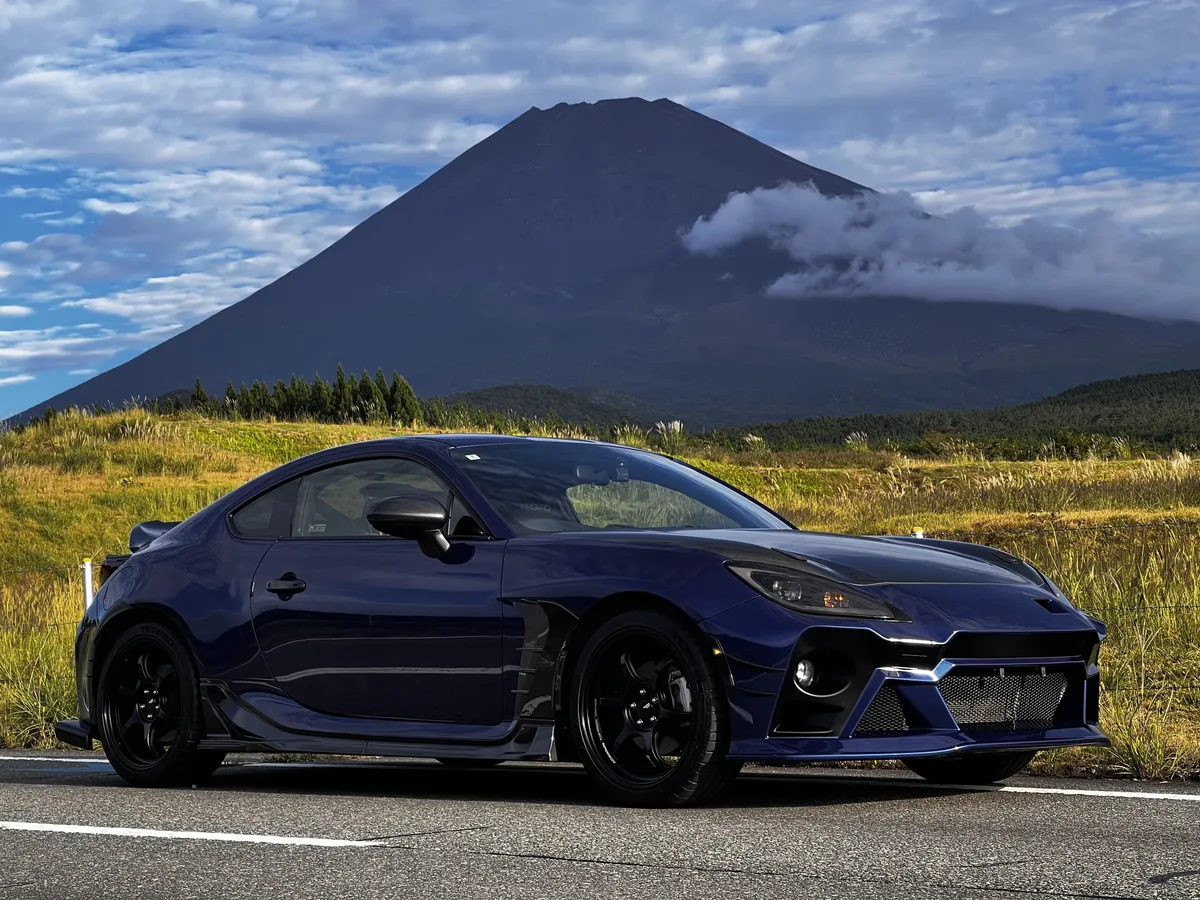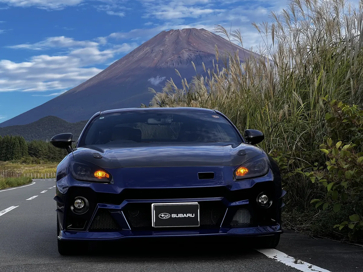 斜め構図の富士山とBRZ