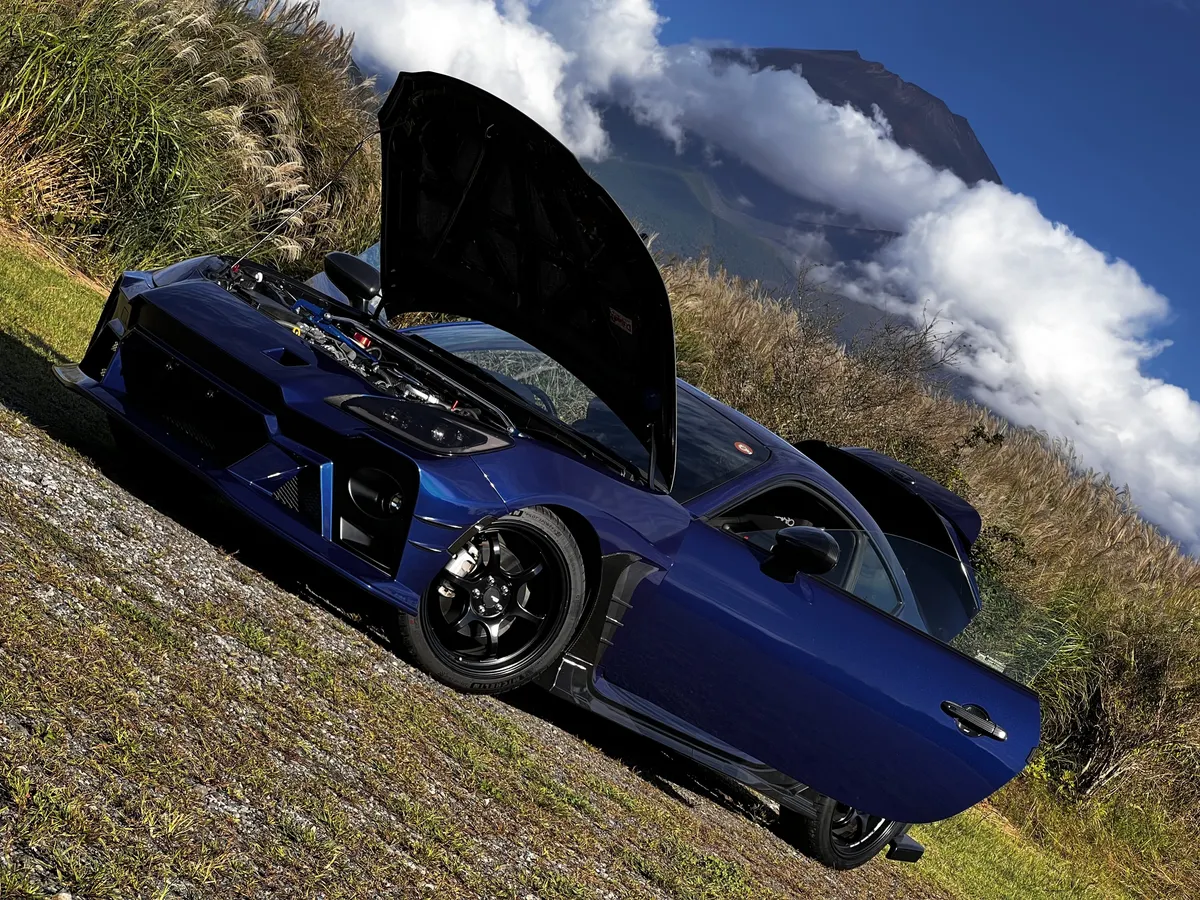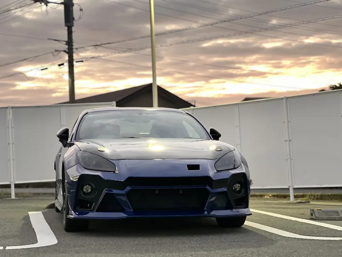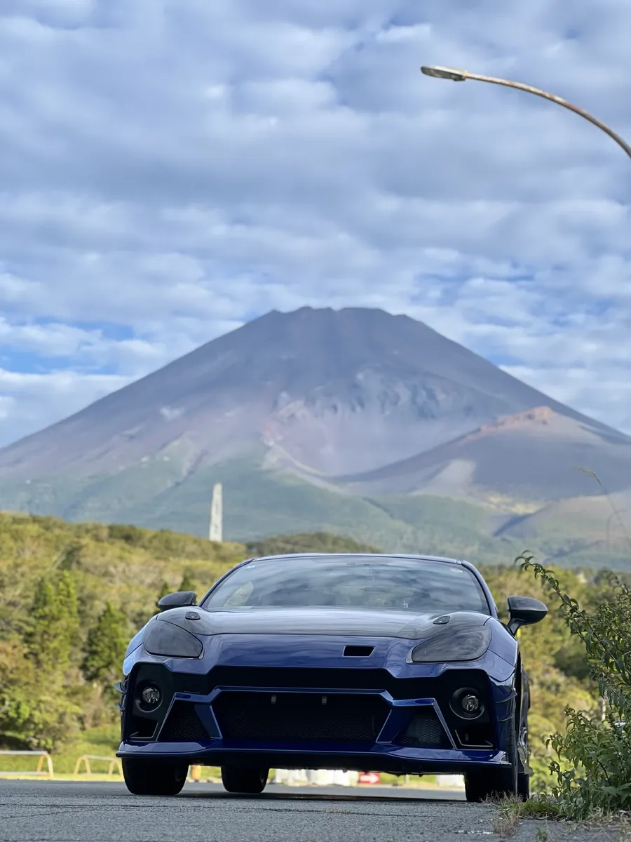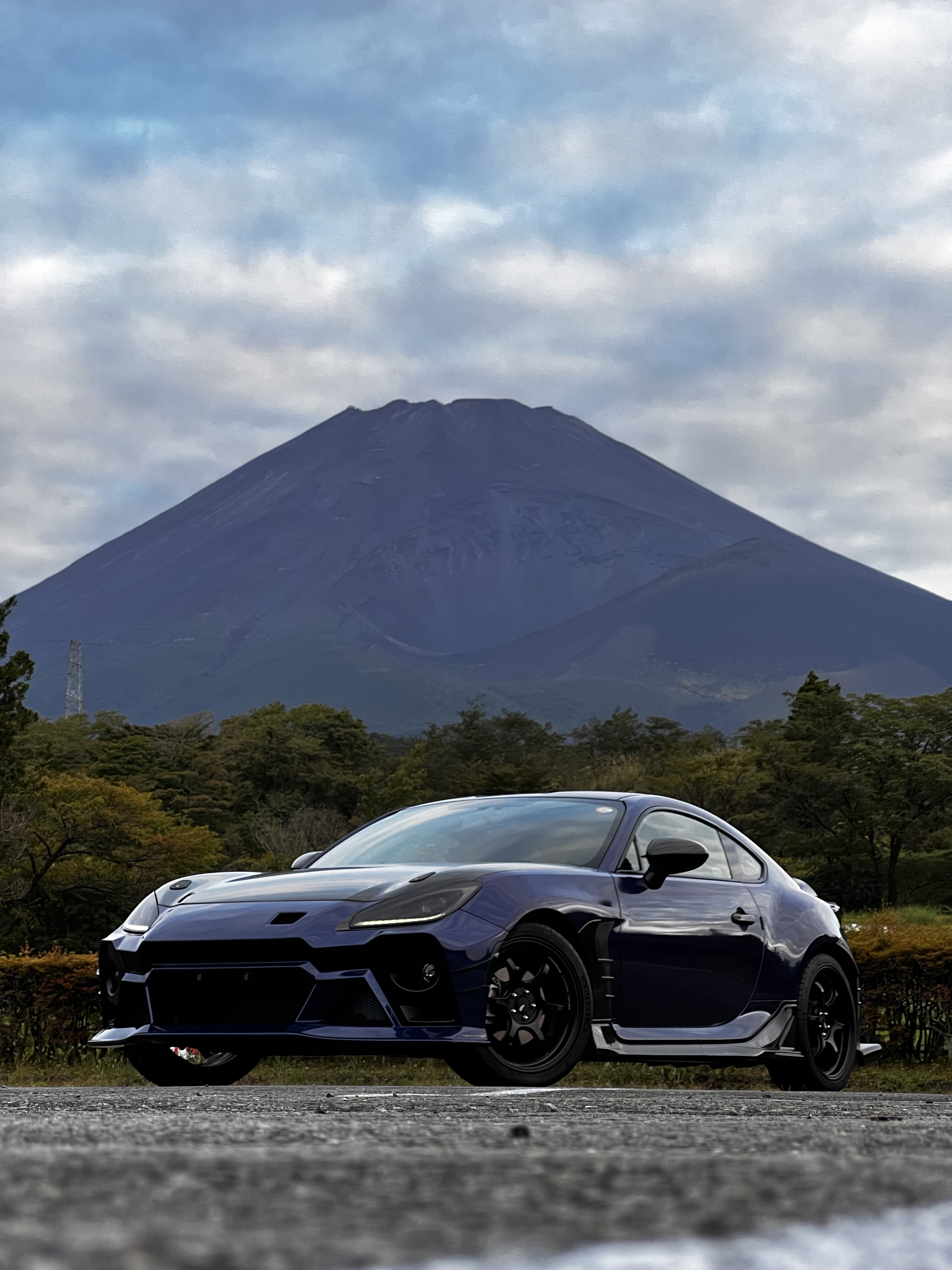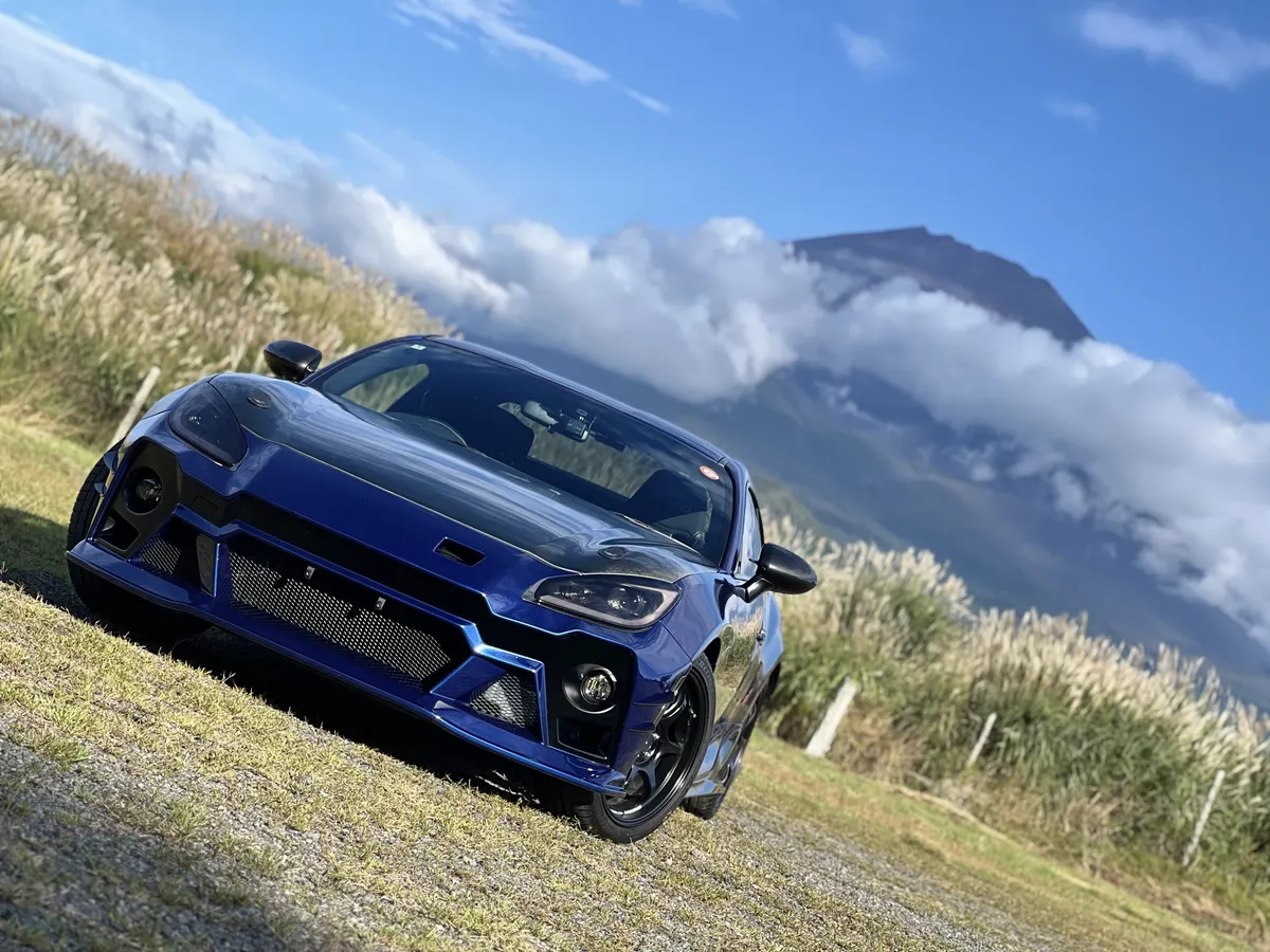 斜め構図の富士山とBRZ