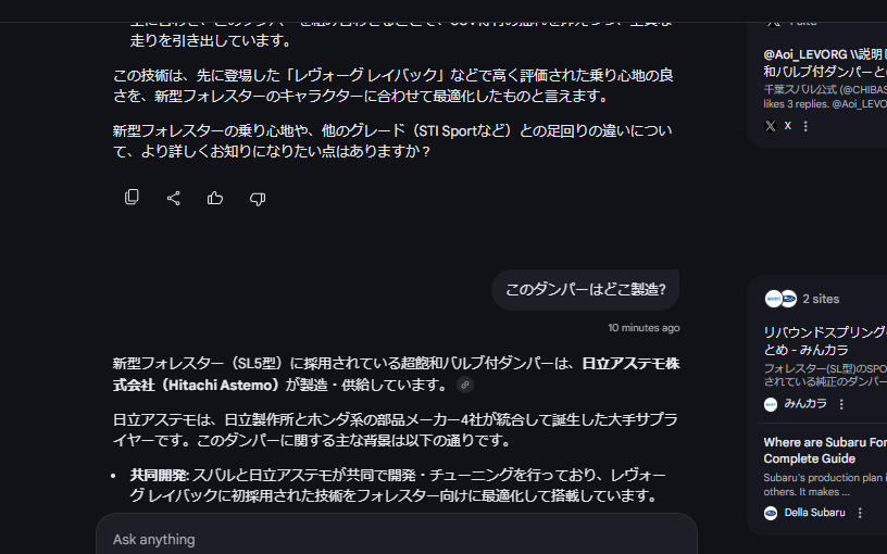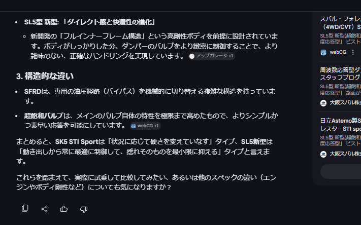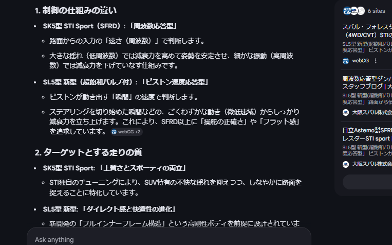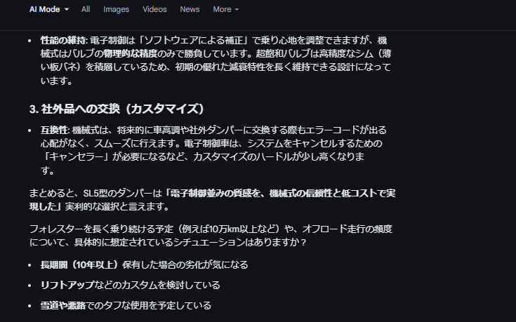 Google先生の回答を、ふーん、へえー、と思いながら見てました。とりあえず、SL5のダンパーはSPORTらしく走らせられるように日立Astemoさんと共同開発したメカダンパーを搭載してるのですね。もし将来STI Sportのグレードが展開されたら、この超飽和ダンパーがいい感じにチューニングされるのでしょうかね。。?気になるところですが、とりあえず僕のブンブン丸には「ちょっと面白いダンパー」がはいってることを知れたので、優越感に浸ってます(てか買う前に知りなさい僕笑)。ではでは👋