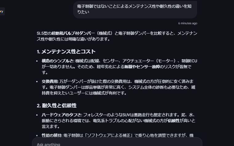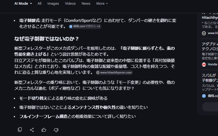 そこで気になったワードが。「超飽和ダンパー」、、?初めて聞きました。面白そうなものですね、カタログの説明だけではちょっと??でしたので、みんなの味方Google先生にパパっと教えていただきました😊(スバルさん公式に聞いたわけではないので、あくまで参考程度に)