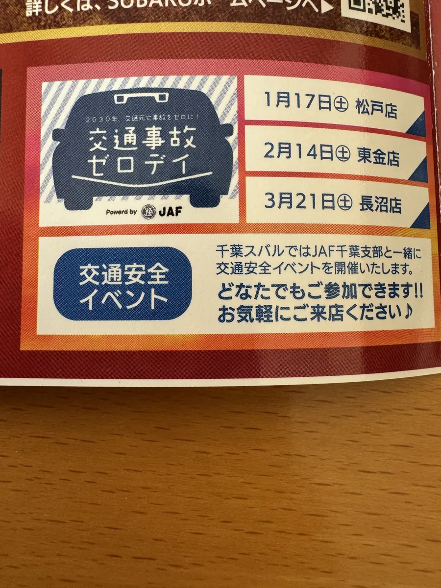 次は昨年10月から各店舗で開催されているJAF千葉支部さんとの交通事故ゼロDAY‼️