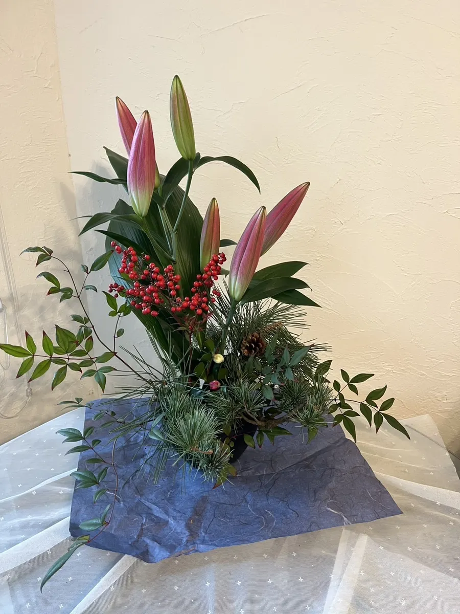 フラワーアレンジメントって季節の花があるから楽しいですね。今だと自然界でも南天の赤い実とかサザンカ、蝋梅や紅梅も少しずつ咲き始めてますよ。