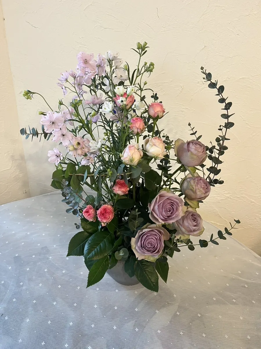 春をイメージしてのアレンジメントはパープルからピンクの濃淡が近づいてくる春を喜ぶ(段々と陽が長くなってきて嬉しい💓)気持ちを表現してくれているように感じました☺️