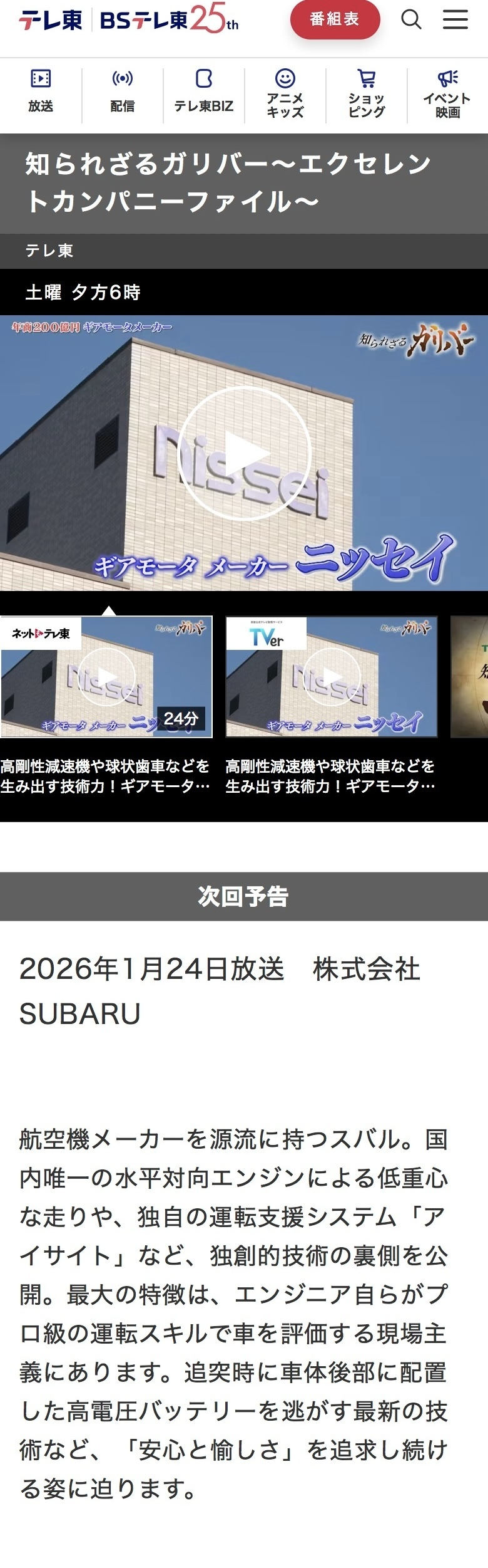トップ > その他 > テレ東系列「知られざるガリバー」 すば魂555 2026/01/17 19:28 テレ東系列「知られざるガリバー」 来週24日18時より 我らがSUBARUの登場です。 https://www.tv-tokyo.co.jp/gulliver/ チェキラ!!! いいね 共有する 共有する X facebook LINE リンクをコピー コメントする 1 件の返信 (新着順) ミュートしたユーザーの投稿です。 投稿を表示 FLAT4.T 2026/01/17 19:50 貴重な情報ありがとうございます 直ぐ録画予約のセットします🙏 いいね 返信する