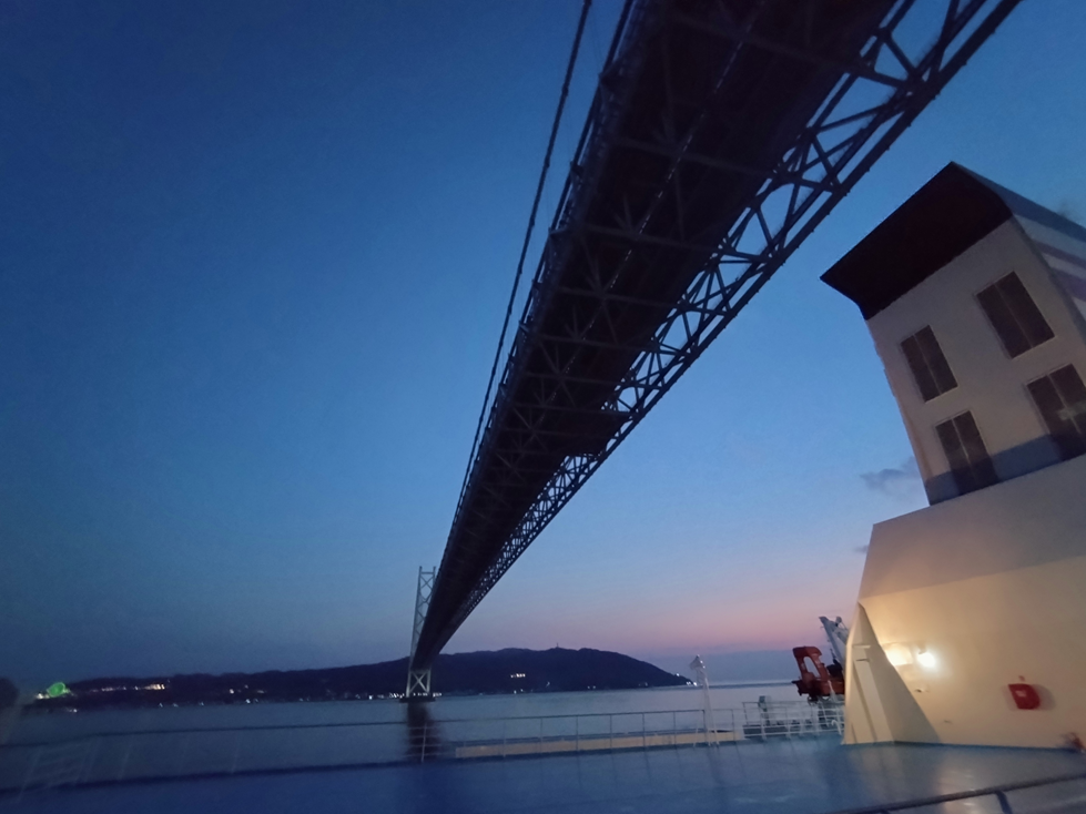▲明石海峡大橋を見上げながら瀬戸内を進むいずみ