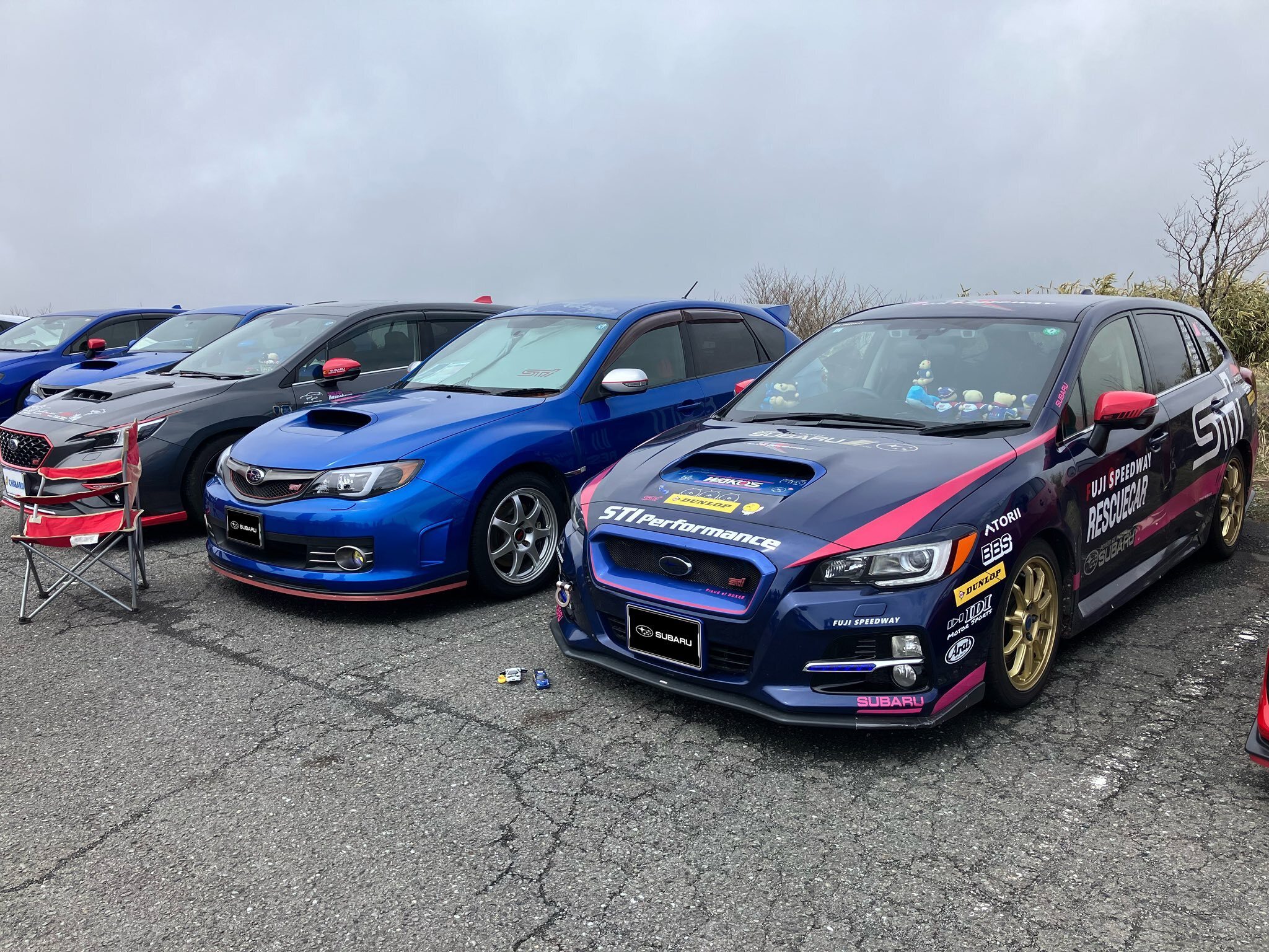 強風、霧、寒冷に苛まれ富士山は殆ど見えませんでしたが、65台のSUBARU車が集結、顔見知りの人も増えてきて楽しく情報交換やクルマ談義に盛り上がりました。