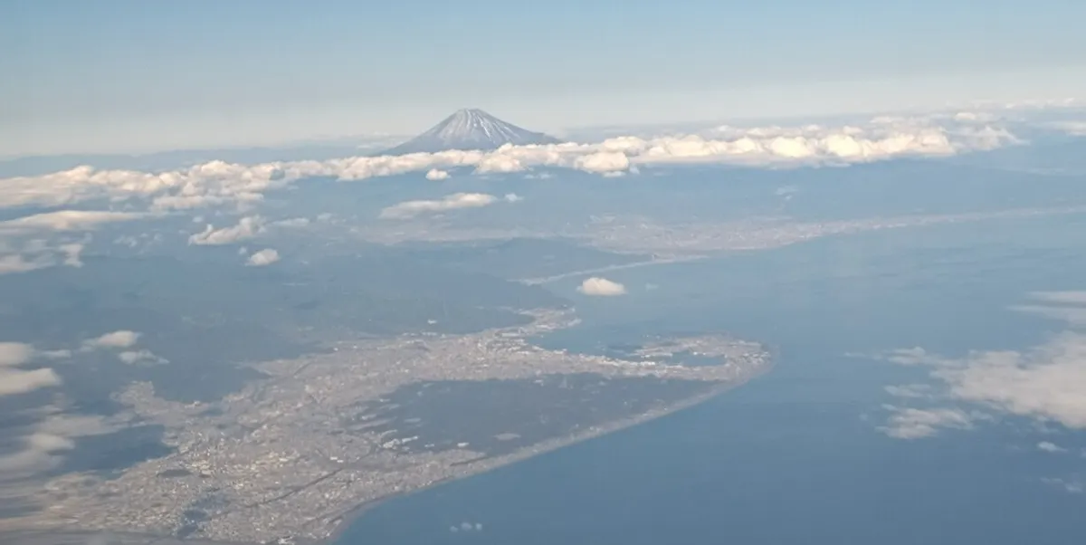 さすが静岡空港だけあって、離陸後すぐ富士山と清水の町が見ます。