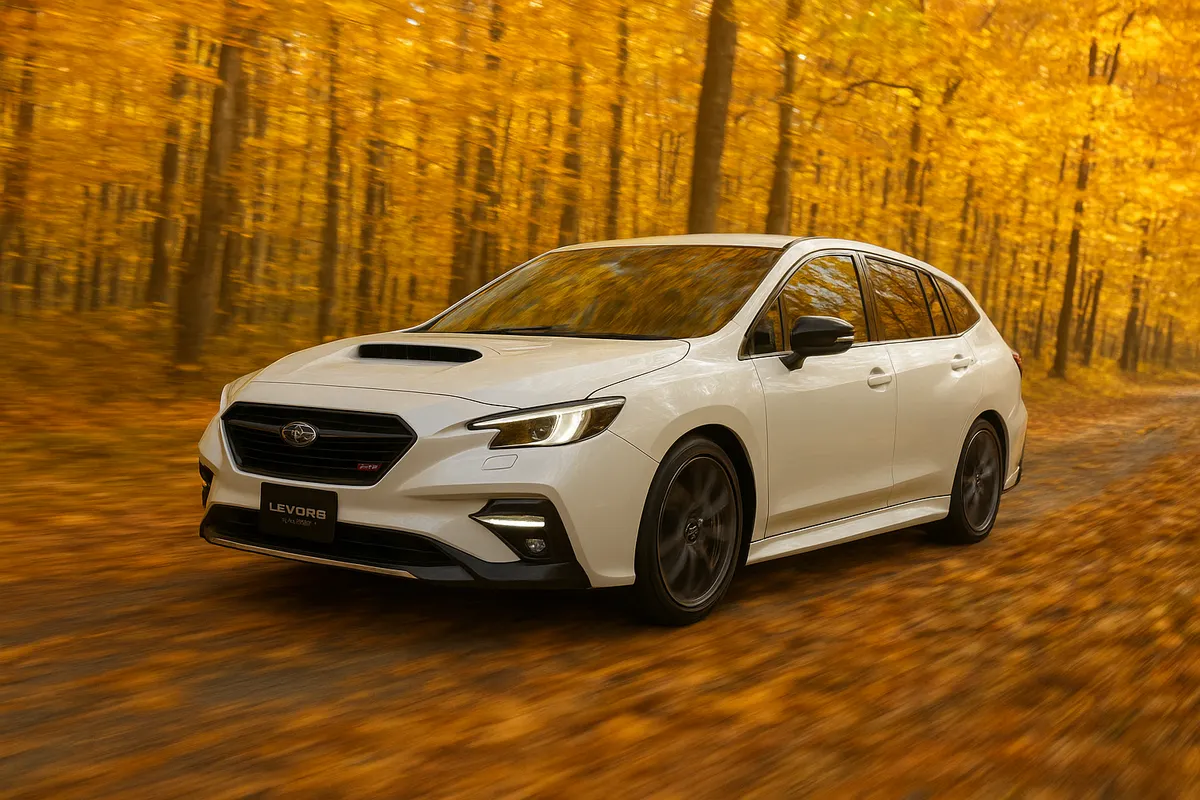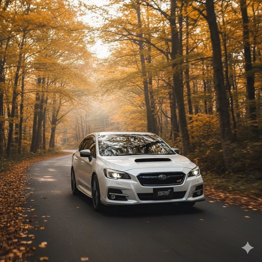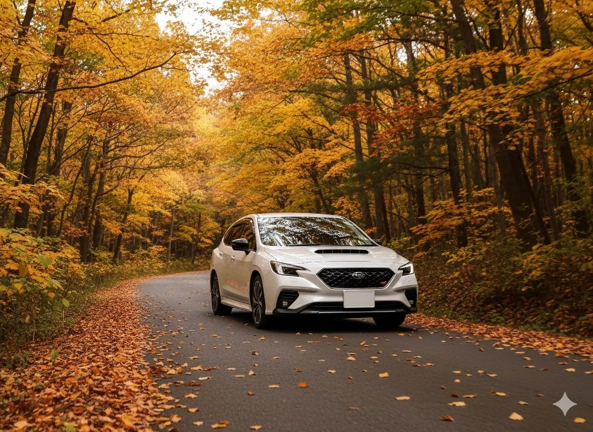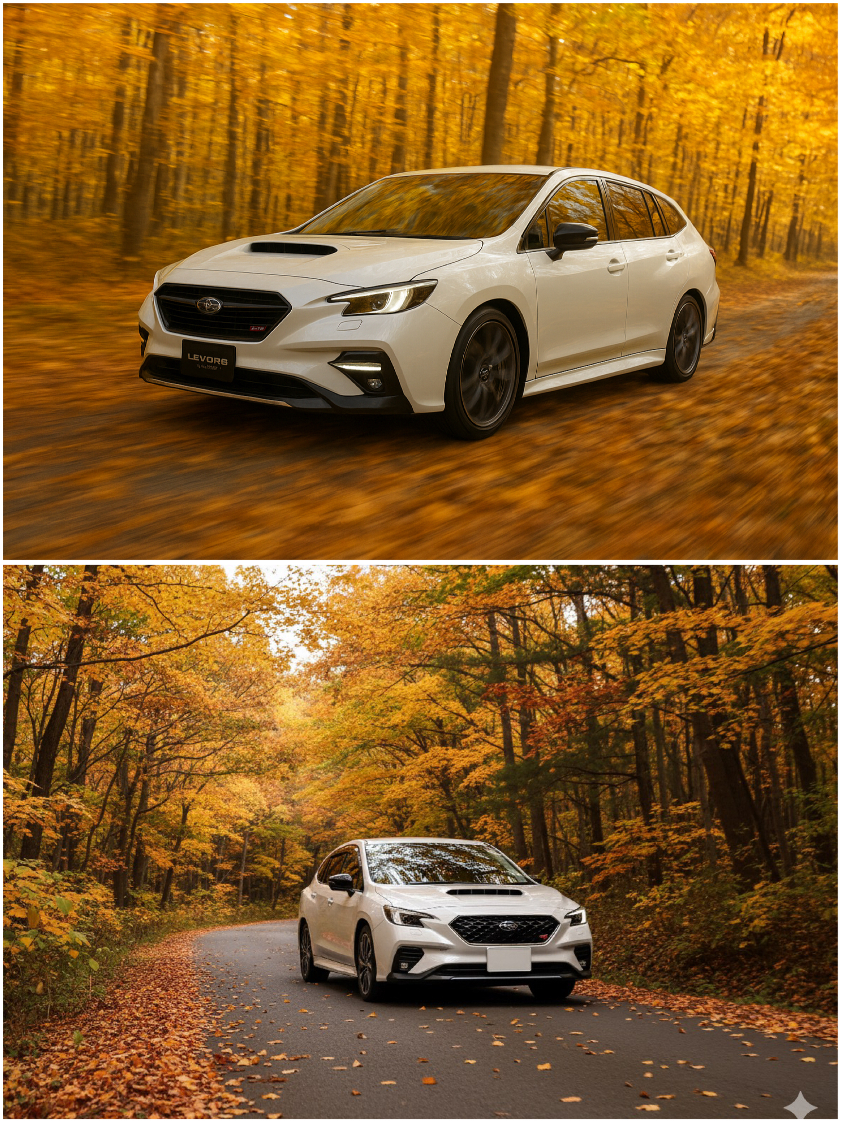 『白いVNレヴォーグSTIスポーツが黄葉した林の中を走行する写真を生成してください』という同じ文章で、ChatGPT と Gemini に画像生成してもらいました。