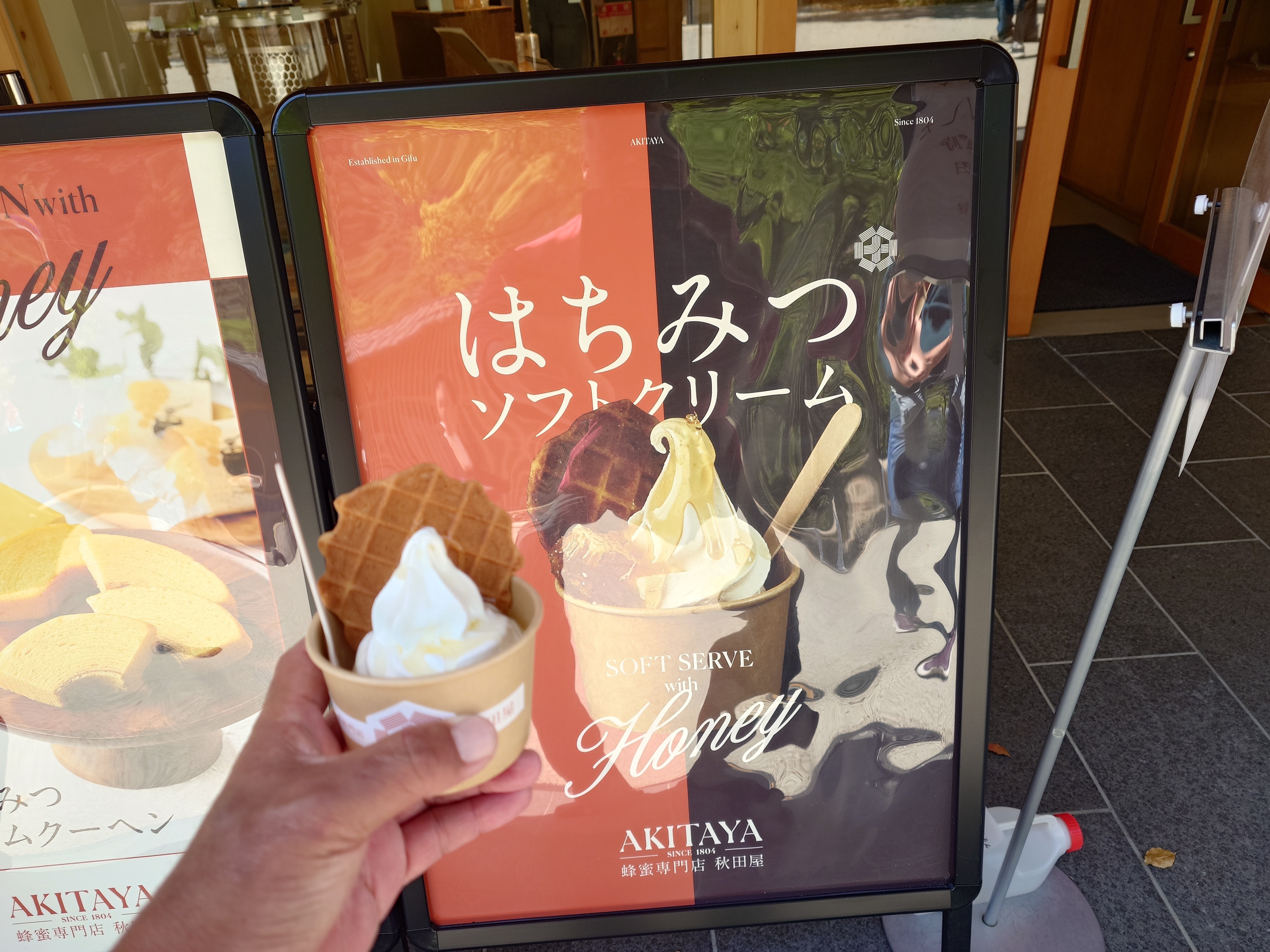 ガイドさんオススメの秋田屋さんのはちみつソフト食べました。ソフト自体も美味しいのですが、はちみつがさらに美味しくて、もう1個食べたいぐらいでした。