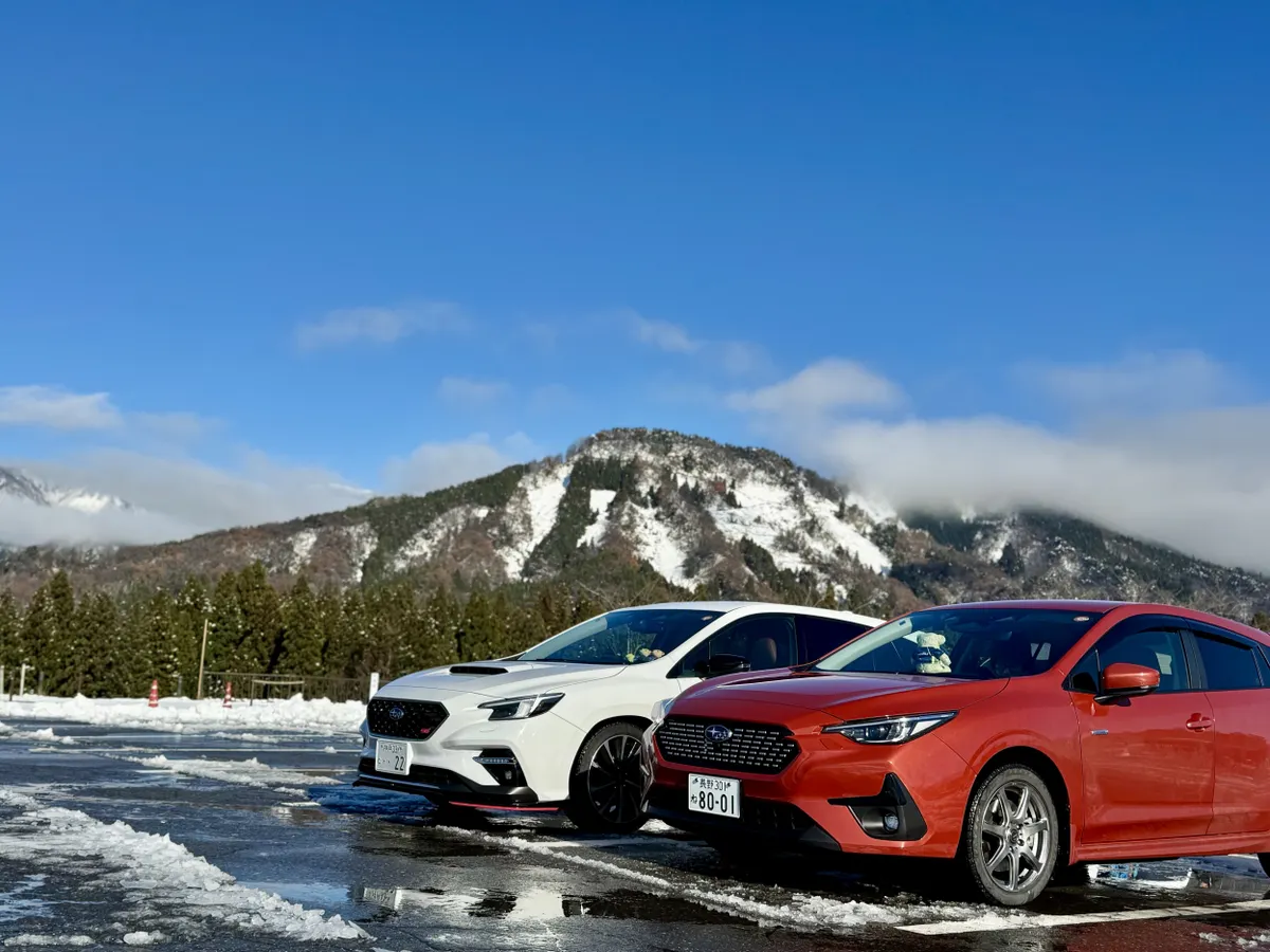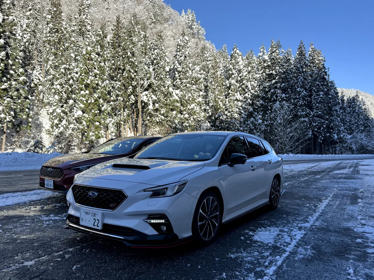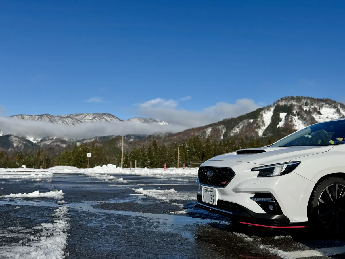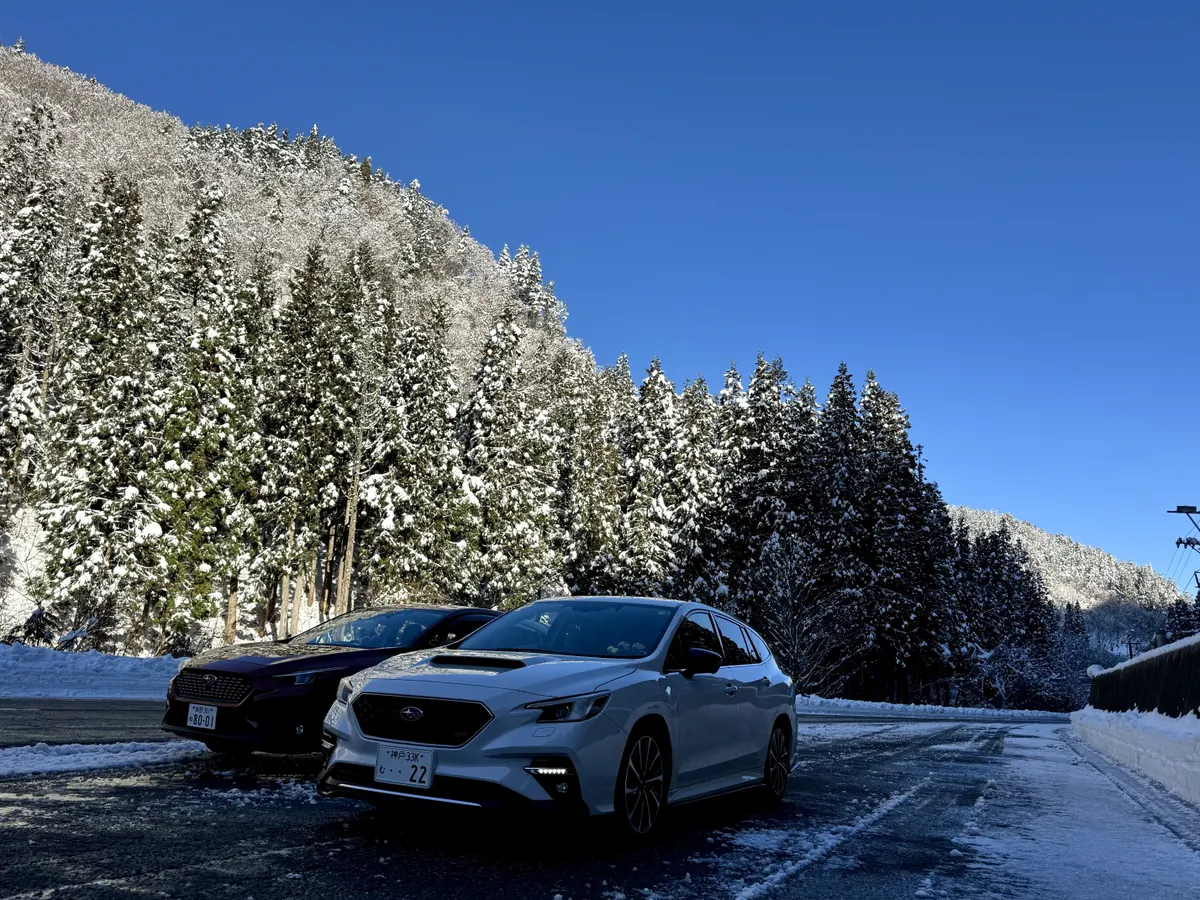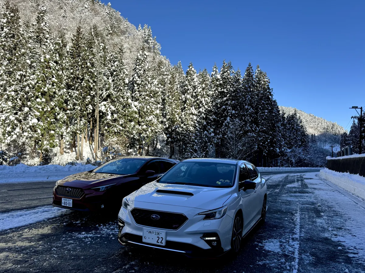 白い雪道を白いレヴォーグが青空の下を北陸の味覚を堪能しながら走る最高の北陸路✨