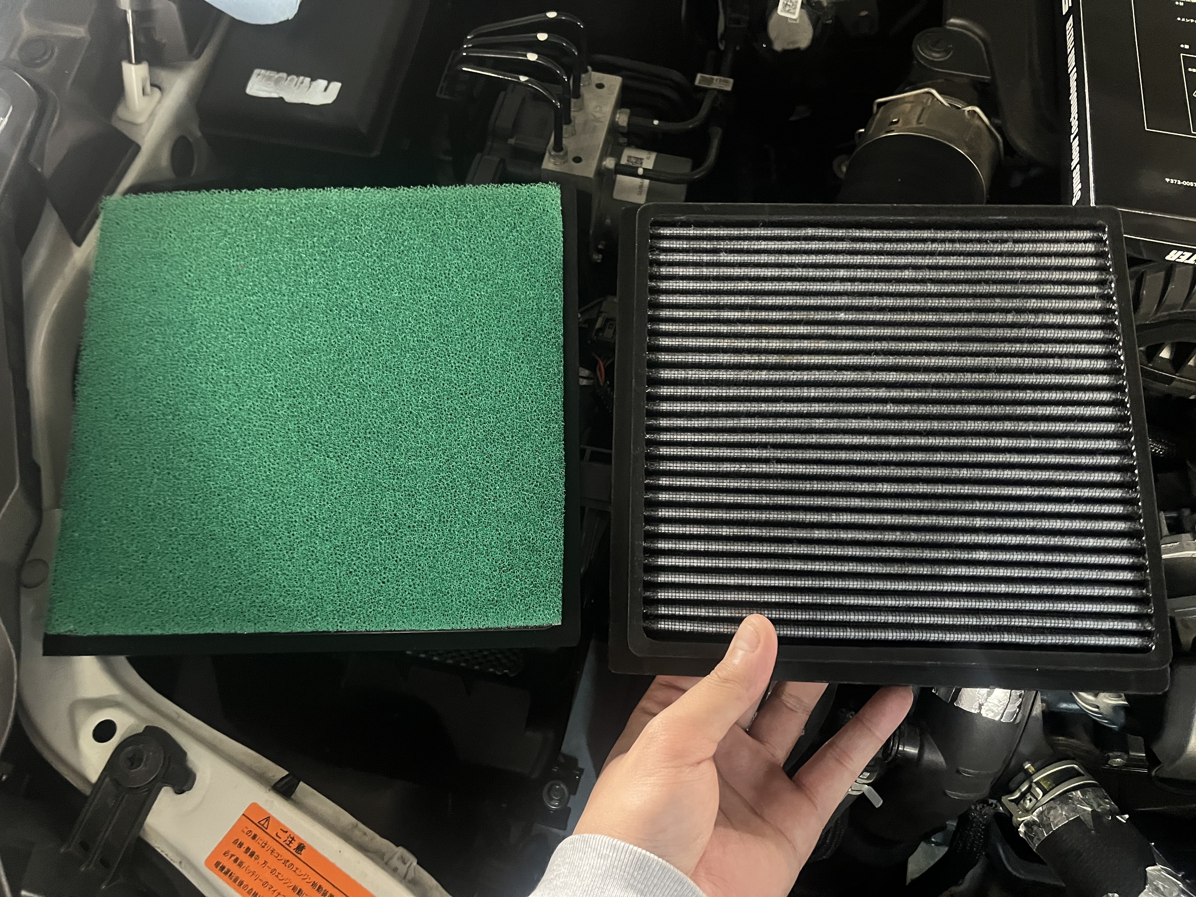 エアコンは、1万キロ使ったデンソーフィルターを外して、Dr.DEOのスチーム消臭をかけ、新品のデンソーフィルターをつけました。フィルター、遠目で見るとちょっと黒いかな?程度ですが、隙間を見るとゴミだらけ。きったねえ笑笑
