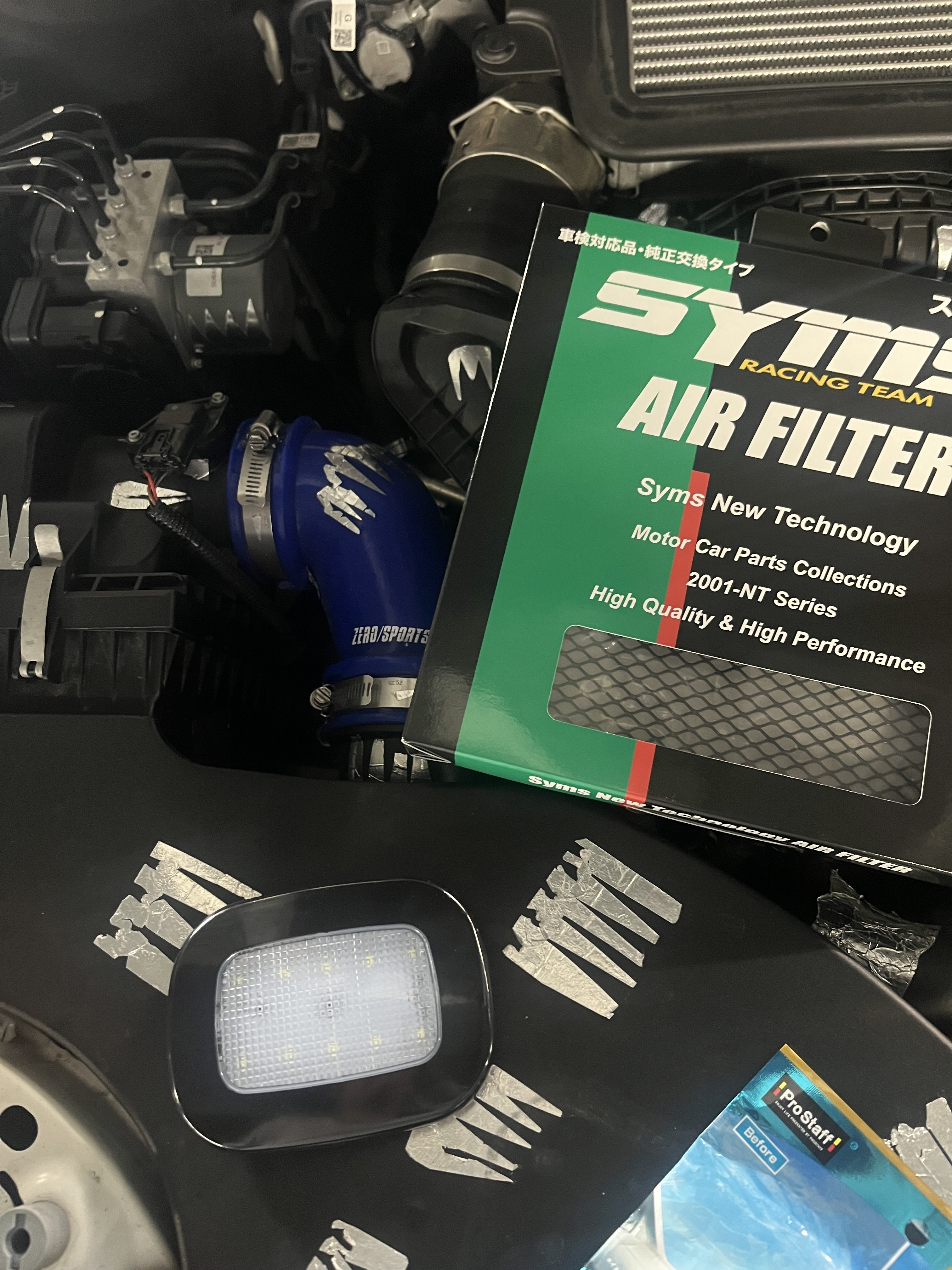 エアインテークボックス内は前回プローバフィルターに交換してから掃除してないので、外せるもの外してウェットシートでふきふき。フィルターも1万キロ使ったので、SYMSさんのフィルターに交換しました。プローバのフィルターはまだ使えそうなので洗っておいて、次ブンブン丸に使おうと思います。