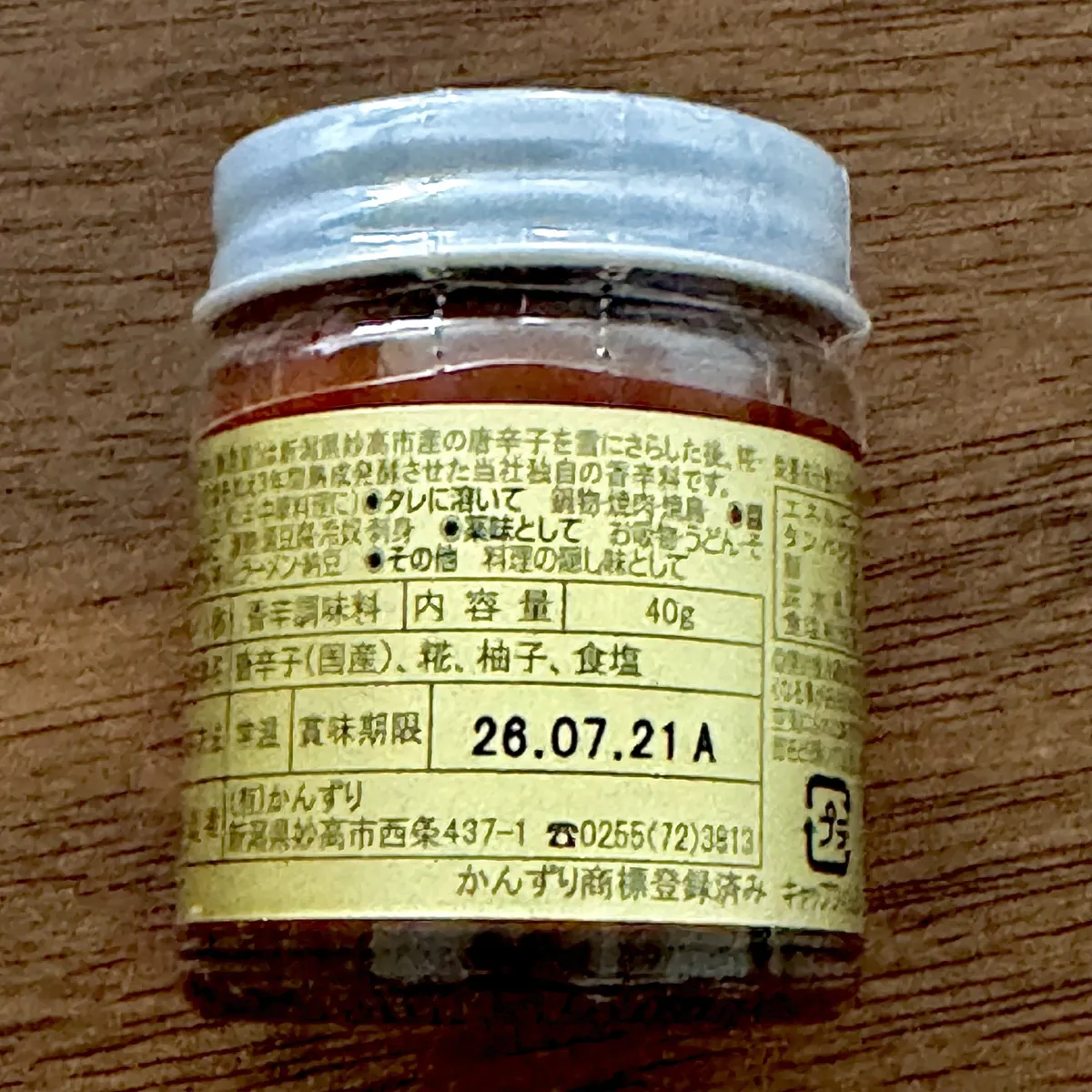 新潟県妙高市産の唐辛子と糀、柚子、食塩を混ぜ合わせ、三年以上の熟成・発酵期間を経て造られた香辛調味料です。