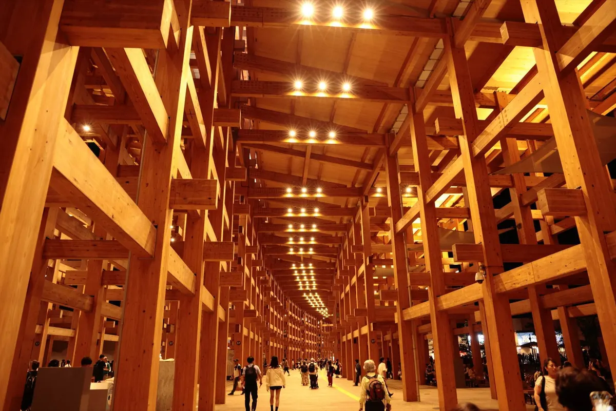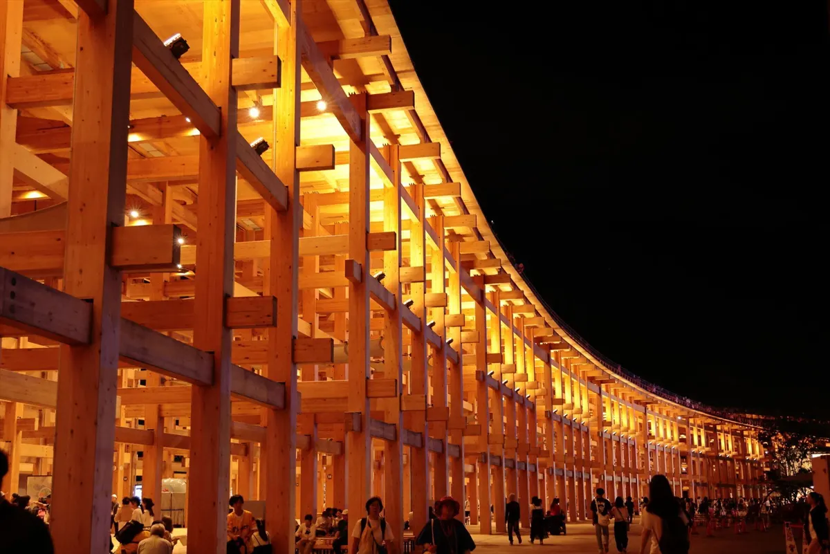 17. ライトアップされた大屋根リングがきれいでした。これとかパビリオンを半年で壊してしまうのはもったいないなと感じました。今しか撮れない姿を写真に残しておきます。