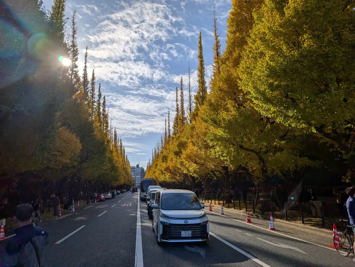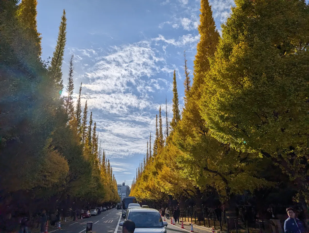 神宮外苑のイチョウ並木も、もうひと息といったところですか。エンスーな車も並びに並んで、「どうだボクのクルマを見てくれ!ごらん、珍しいだろ?当時の二桁ナンバーだろう?ボンネットの中も見るかい?珍しいだろ〜🤓中々こんなお宝は見れないよ?ん?どうだい?」