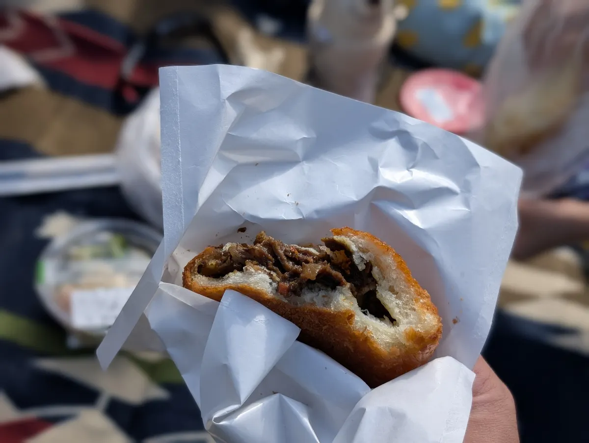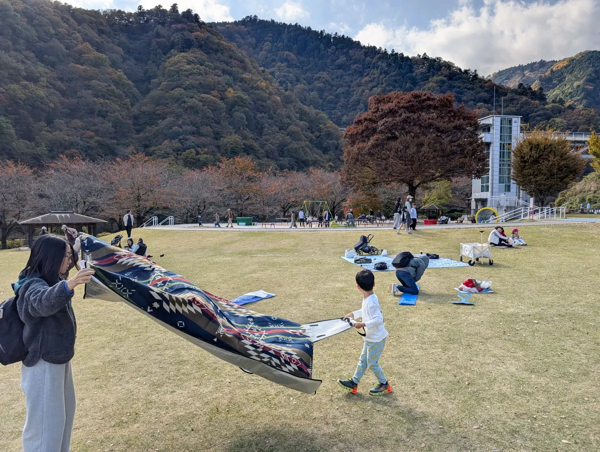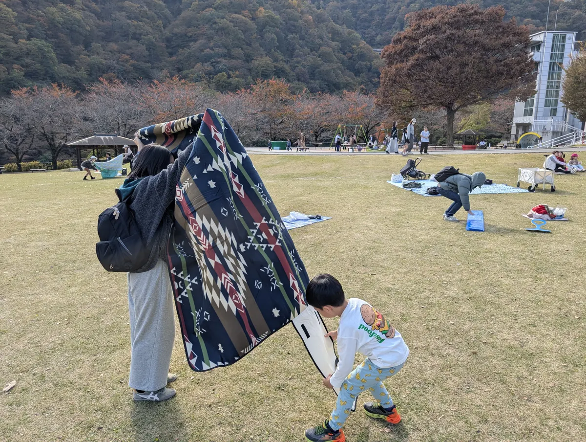 途中パン屋さんでパンを買って、あいかわ公園でレジャーシート拡げてお昼ご飯です。