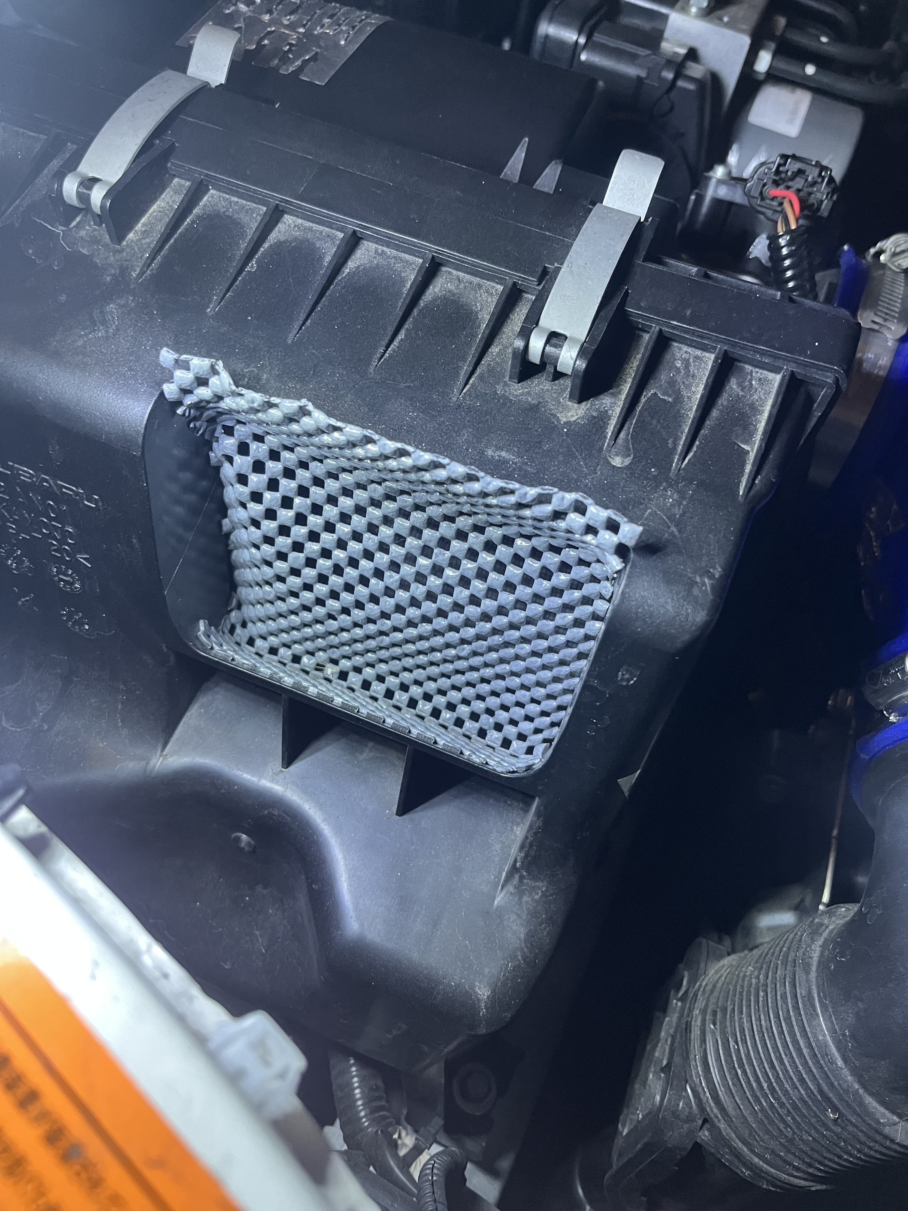 2月ほど前の投稿でレビューしたスンスンちゃんの激カンタムシリーズのエアクリーナー。当初エアクリボックスの蓋に挟んで上から吊り下げるような形でして、効果は抜群ですが取り付け位置について課題があり(これ自体は寝かせて使うことを想定、なんとか立たせて使えないか?)、考えた結果アイキャッチ画像のようになりました。エアクリボックスとエアダクションボックスの間に激カンタムを挟んだのみです。吸い込む空気全部このエアクリに通してからプローバフィルターに行かせる、という考えです。取り付けはちょっとコツいりましたが強引にオリャッと、適当すぎて笑っちゃいました笑。