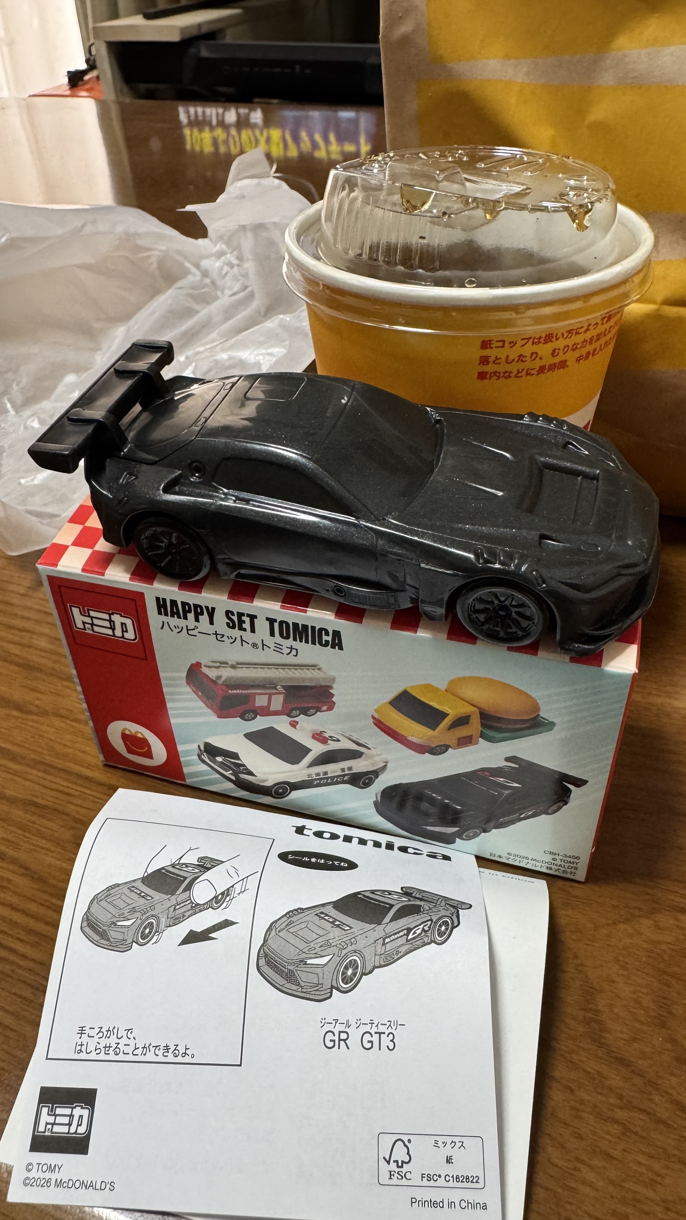 トップ > フリートーク > フリートーク > 若い頃に マクドナルドでハッピーセットを買っ... P555 2026/04/15 22:22 <p>若い頃に マクドナルドでハッピーセットを買って以来 何十年ぶりかの ハッピーセット購入。</p><p>目的は GR GT3 ❗️</p><p>自分は購買運は無いので さすがに貰えないだろうと気軽に買ったら なんとまさかの GR GT3‼️ </p><p>ここで今年の運を使ってしまった😅</p><div class="se-component se-image-container __se__float-none"><figure><img src="https://community.dl-asobica.com/public/uploads/ckeditor/pictures/1099883/7bd3c3de-fa81-42d4-b7aa-6dd9072d3597.jpeg" alt="" data-rotate="" data-proportion="true" data-size="," data-align="none" data-percentage="auto,auto" data-file-name="7bd3c3de-fa81-42d4-b7aa-6dd9072d3597.jpeg" data-file-size="undefined" data-origin="," style=""></figure></div><div class="se-component se-image-container __se__float-none"><figure><img src="https://community.dl-asobica.com/public/uploads/ckeditor/pictures/1099885/5a54e973-2de9-4840-9b08-11d0a43158c9.jpeg" alt="" data-rotate="" data-proportion="true" data-size="," data-align="none" data-percentage="auto,auto" data-file-name="5a54e973-2de9-4840-9b08-11d0a43158c9.jpeg" data-file-size="undefined" data-origin="," style=""></figure></div><p><br></p> 若い頃に マクドナルドでハッピーセットを買って以来 何十年ぶりかの ハッピーセット購入。 目的は GR GT3 ❗️ 自分は購買運は無いので さすがに貰えないだろうと気軽に買ったら なんとまさかの GR GT3‼️ ここで今年の運を使ってしまった😅 いいね 共有する 共有する X facebook LINE リンクをコピー トークにコメントする 1件のコメント (新着順) ミュートしたユーザーの投稿です。 投稿を表示 スバばあちゃん 2026/04/16 00:35 マクドのトミカシリーズ、ボンネットあいたり意外と凝ってました これは買いにいかねばですね🤣 いいね 返信する
