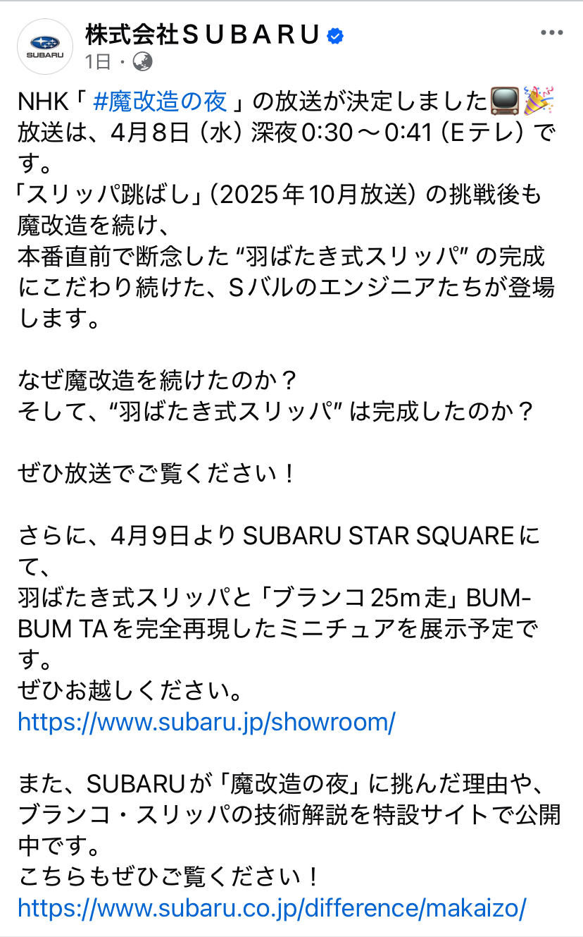 トップ > フリートーク > フリートーク > みなさま既にご存知かもしれませんが💦FBに載... テレマーカー 2026/04/07 20:46 <div class="se-component se-image-container __se__float-center" style="min-width: 100%; width: 75%"><figure style="width: 75%;"><img src="https://community.dl-asobica.com/public/uploads/ckeditor/pictures/1088389/5804383b-ec36-4b7f-8f21-a978d73a290b.jpeg" alt="" data-rotate="" data-proportion="true" data-align="center" data-size="75%," data-file-name="5804383b-ec36-4b7f-8f21-a978d73a290b.jpeg" data-file-size="undefined" data-origin="75px,50px" data-percentage="75," origin-size="828,1329" style="width: 100%;"></figure></div><p>みなさま既にご存知かもしれませんが💦FBに載っていました。11分の番組、今夜放送するんですね。この時間まで起きていられないので💤録画予約しました!</p> みなさま既にご存知かもしれませんが💦FBに載っていました。11分の番組、今夜放送するんですね。この時間まで起きていられないので💤録画予約しました! 魔改造の夜夜明け編26年春 スリッパ跳ばし完成編? いいね 共有する 共有する X facebook LINE リンクをコピー トークにコメントする 1件のコメント (新着順) ミュートしたユーザーの投稿です。 投稿を表示 こたちゃん 2026/04/07 22:13 昨年行われた、2025スバ学祭で羽ばたき式スリッパ展示とデモで飛ばしていました。どんな進化をしたのか興味津津です。 いいね 返信する ミュートしたユーザーの投稿です。 投稿を表示 テレマーカー 2026/04/07 22:56 こたちゃん こんばんは! スバ学祭まだ参加した事ないので実物をご覧になったなんて羨ましいです✨ 11分という短い番組の中にギュっと濃縮された内容をついつい期待😅進化を遂げたバージョンを今年のスバ学祭でやって頂けたら嬉しいなぁ〜なんて思いました。 コメント頂きましてありがとうございました😊 いいね 返信する