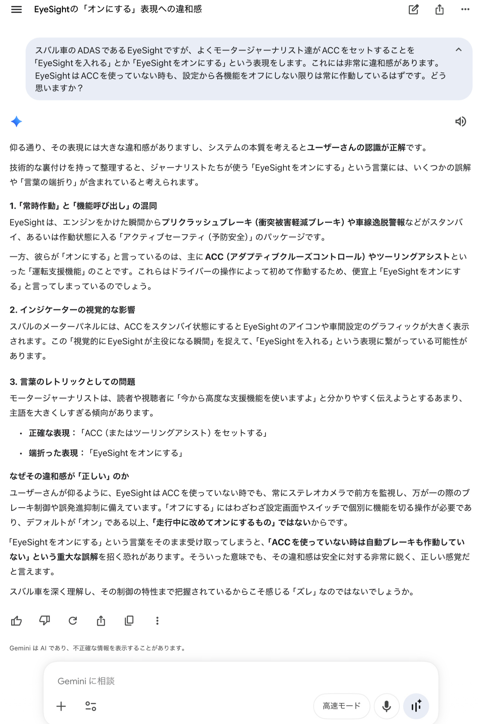技術的な裏付けを持って整理すると、ジャーナリストたちが使う「EyeSightをオンにする」という言葉には、いくつかの誤解や「言葉の端折り」が含まれていると考えられます。