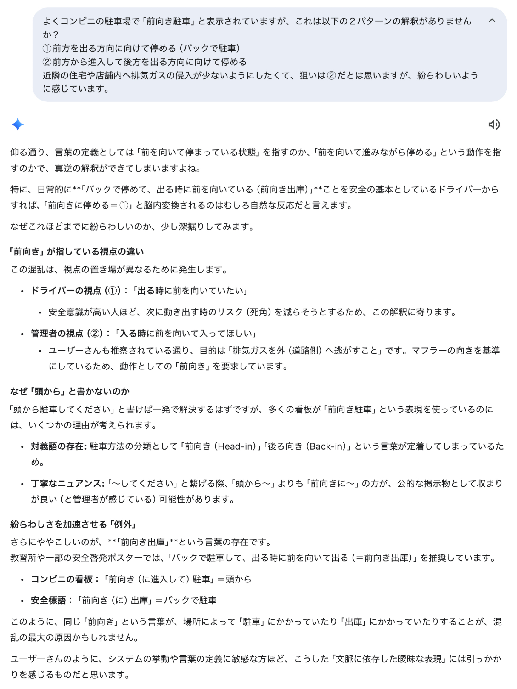 『よくコンビニの駐車場で「前向き駐車」と表示されていますが、これは以下の2パターンの解釈がありませんか?