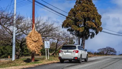 スバルと民俗集落境には、災いをもたらすものを祓い退けたい願いとして、「ミチキリ」として護符などが吊るされることがありますよね。新潟県佐渡市の大倉谷集落では、これほどの大男がムラにはいるんだぞ、と鬼を驚かすような大わらじを飾ります。正月など、春来る鬼に対して作るのが本来だと思いますが、現在では3月最初