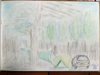 オートキャンプの思い出 オートキャンプを始めた頃に「何かキャンプっぽい趣味を」とA5くらいのスケッチブックに描いたものです。スケッチの日付を見ると、1992年の秋のようです。車は、当時乗っていたレックスコンビ・ターボ。商用車なので、後席を倒すとキャンプ道具が驚くほどたくさん積めました。初めての自分名義の愛車でしたが、経済的