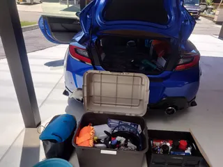 2025/08/14 デリバリー洗車②(出張編) 【前回の続き】予備洗浄が終わり、あくる朝はデリバリーの準備です。 7月からの約束で、娘の車のコーティングに行って来ました! BRZってリアシート倒すと結構積めるんですよ!ちなみに新潟遠征の時は家内がラゲッジで寝てました(笑)ただしリアハッチは狭すぎて入りません。ドア全開でシートを