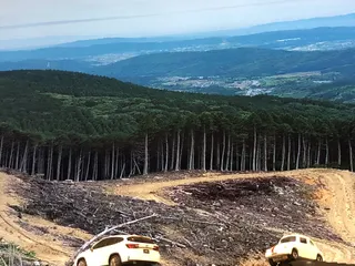 ジオラマごっこ 山から遠くに有明海が見えます。伐採跡地にミニカーを並べてオフロードコース風に。
