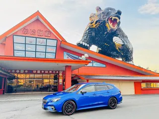 レヴォーグが熊に襲われそう‼️ 白老町虎杖浜カニ御殿の熊とレヴォーグを撮影しました。熊にレヴォーグ襲われそうに見えます。