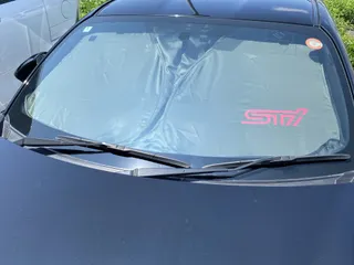 STIサンシェード(黒色) 8月から発売が始まった、STIサンシェード(黒色版)を購入し装着しましたが、なかなか良いものですね!黒ボディなので、統一感が出てヨシ!😄 中から見た状態ケース兼ハンドルカバーの布の手触りが良くてコレも良い!😁