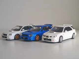 1/64 GG型インプレッサワゴン GG型インプレッサワゴンのミニカーがまとめて届きました。 ついでに手持ちのGD型セダンも並べて撮影。・・・と思ったら、鷹の目のセダンが無かった・・・ 後ろもしっかり作り分けてあります。こうして並べてみると、同じGD/GGインプレッサでも 前期・中期・後期、そしてセダンとワゴンで雰囲気が違っていて面白