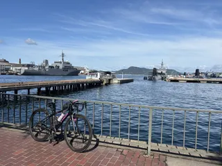 1泊2日自転車旅 〜2日目〜 フロントの方オススメの「アレイからすこじま」に行くことにしました。「アレイからすこじま」は世界的にも珍しい潜水艦や護衛艦が見える公園です。潜水艦が5隻もいます!!これだけの数の海上自衛隊の護衛艦にお目にかかれることは滅多にないので感激です🤩向いに眺めの良いカフェがあったのでのんびり食事をしながら潜水