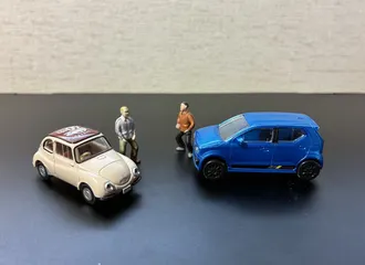 軽自動車今昔 今の軽自動車と比較してもスバル360は小さいですが存在感は大と思いますドラッグストアの入口にアルトワークスのミニカー(ガチャガチャ)が有りましたので比較用につい買ってしまいました