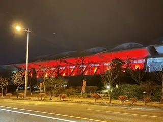 アイスホッケーチーム レッドイーグルスの本拠地であるネピア アイスアリーナです。レッドイーグルスのチームカラーであるレッドにライトアップされてました。