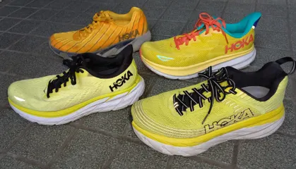 🟨イエローシューズ🟨 来年の第3回「ふくい桜マラソン」もエントリー開始日に早速エントリー終了。宿も取りました。さあ~トレーニング開始🏃とガーミンのランウオッチを付けて走っております。 下駄箱から今、使ってるシューズ。出したところ「あらま!全てイエロー🟨」 車はWRブルーのこだわり!シューズはイエローの