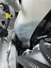 LLCリザーバータンクの液量 100キロほど走ったところでLLCのリザーバータンクを見ると、けっこうな量が入ってるように見えますね。冷間時にはLOWとFULLの間でしたが、FULLの線を軽く超えてます😆これだけ熱膨張するのですね〜🧐補充の際にうっかりFULLまで入れたら、これは溢れそうです!🤣