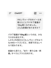 NEW 教えて!チャッピー!🤣 我が家のVNレヴォーグのホイールをBBSに替え、バネ下重量を16kg軽量化したので、どんな影響があるかチャッピーに聞いてみました♪https://community.subaru.jp/announcements/pcb8w08cyqb9mnvvなるほど〜。意外と期待していた燃費は変わらないのね